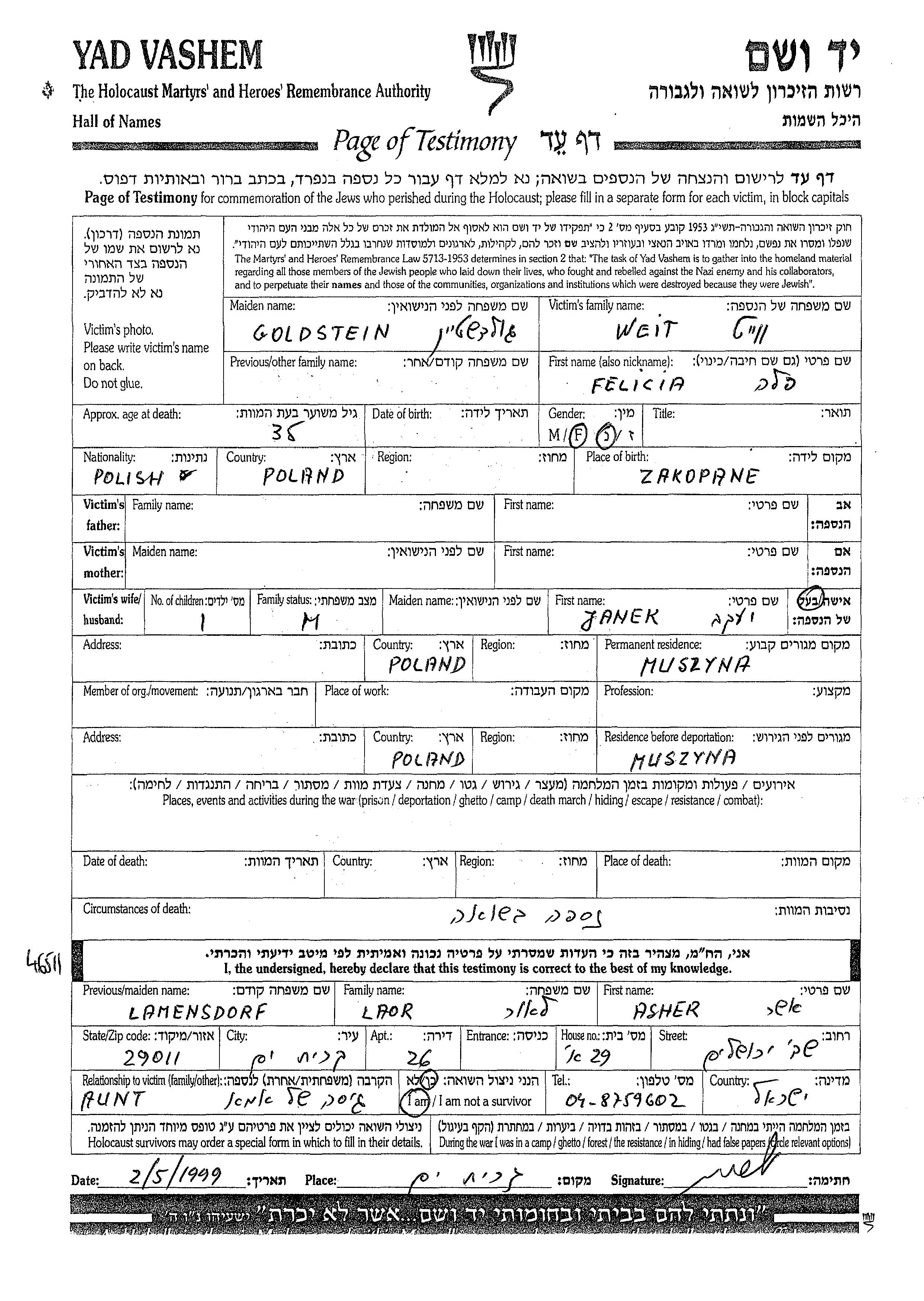 Felicia Weit nee Goldstein was born in Zakopane, Poland. She was married to Janek Yaakov. Prior to WWII she lived in Muszyna, Poland. During the war she was in Muszyna, Poland. Felicia was murdered in the Shoah.