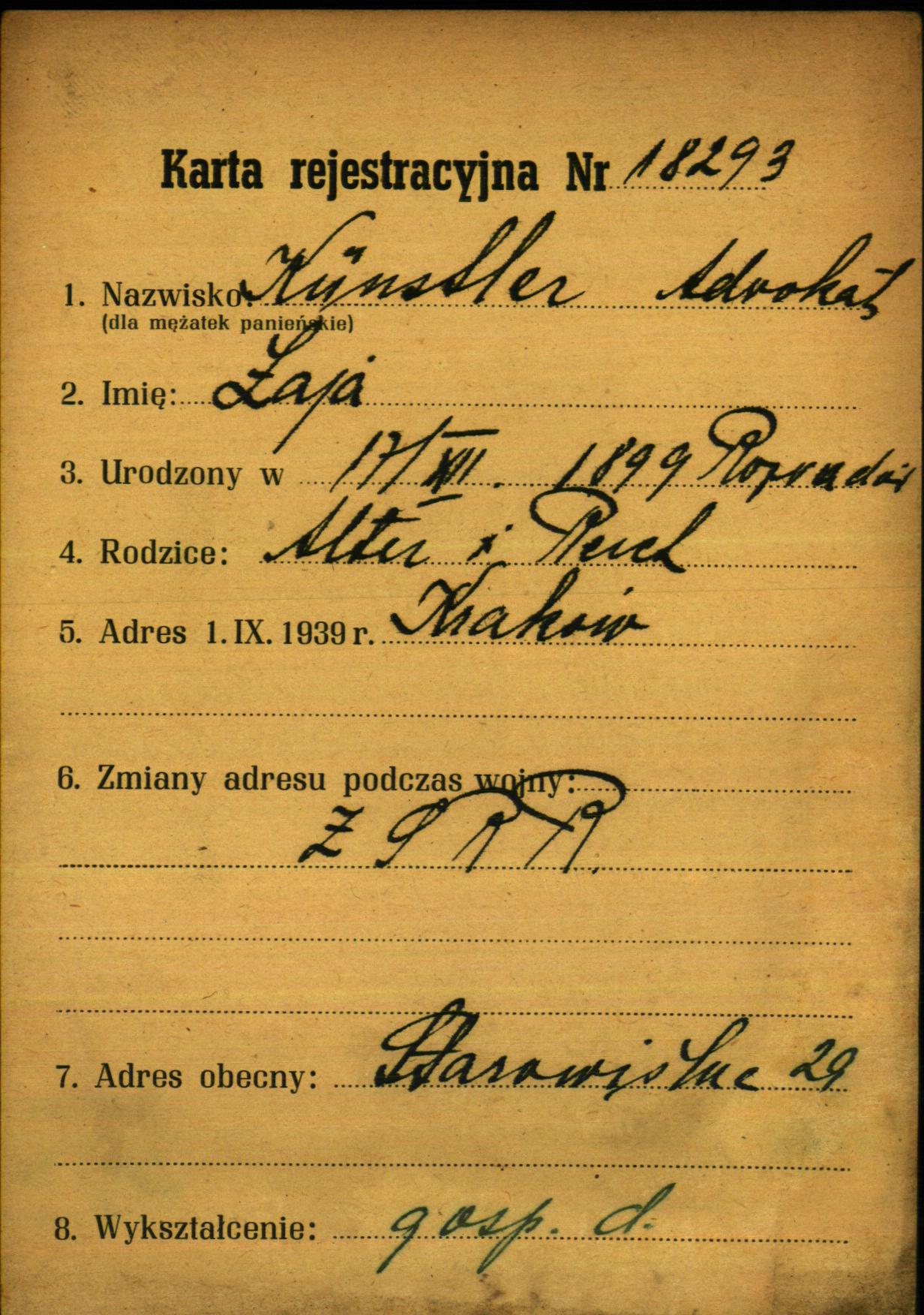 Łaja Künstler was born in Rozwadów, Poland, 1899 to Alter and Reizl. She was a housewife and married. Prior to WWII she lived in Krakow, Poland. During the war she was in Soviet Union. Łaja survived the Shoah.