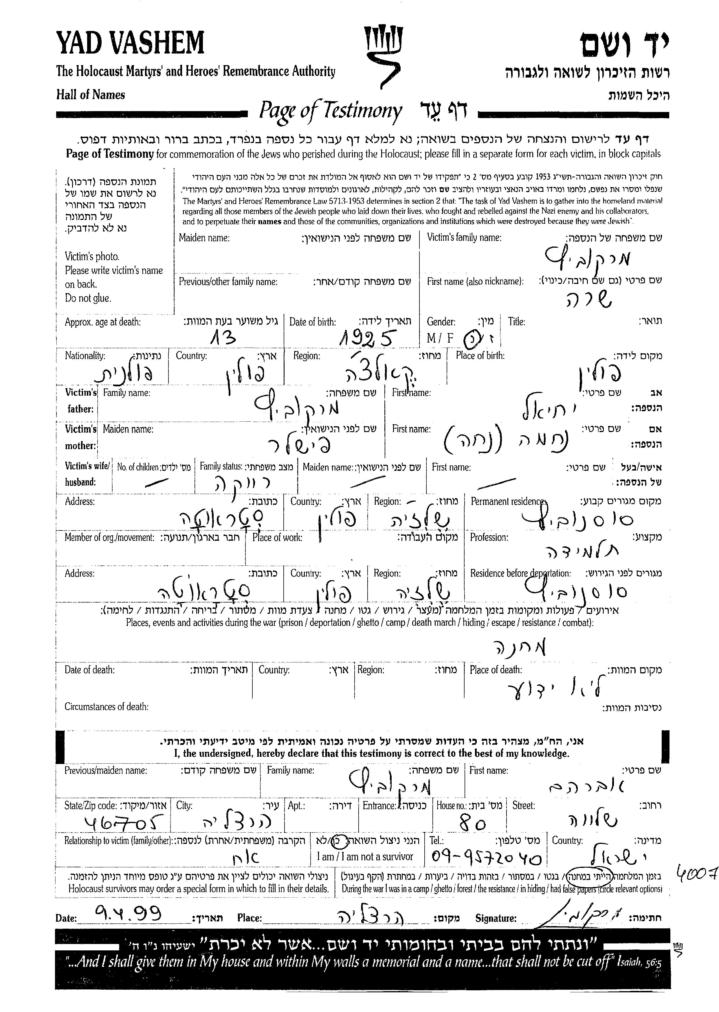 Sara Markovitz was born in Kielce, Poland, 1925 to Yekhiel and Nekhama. She was a pupil and single. Prior to WWII she lived in Sosnowic, Poland. During the war she was in Sosnowic, Poland. Sara was murdered in the Shoah.