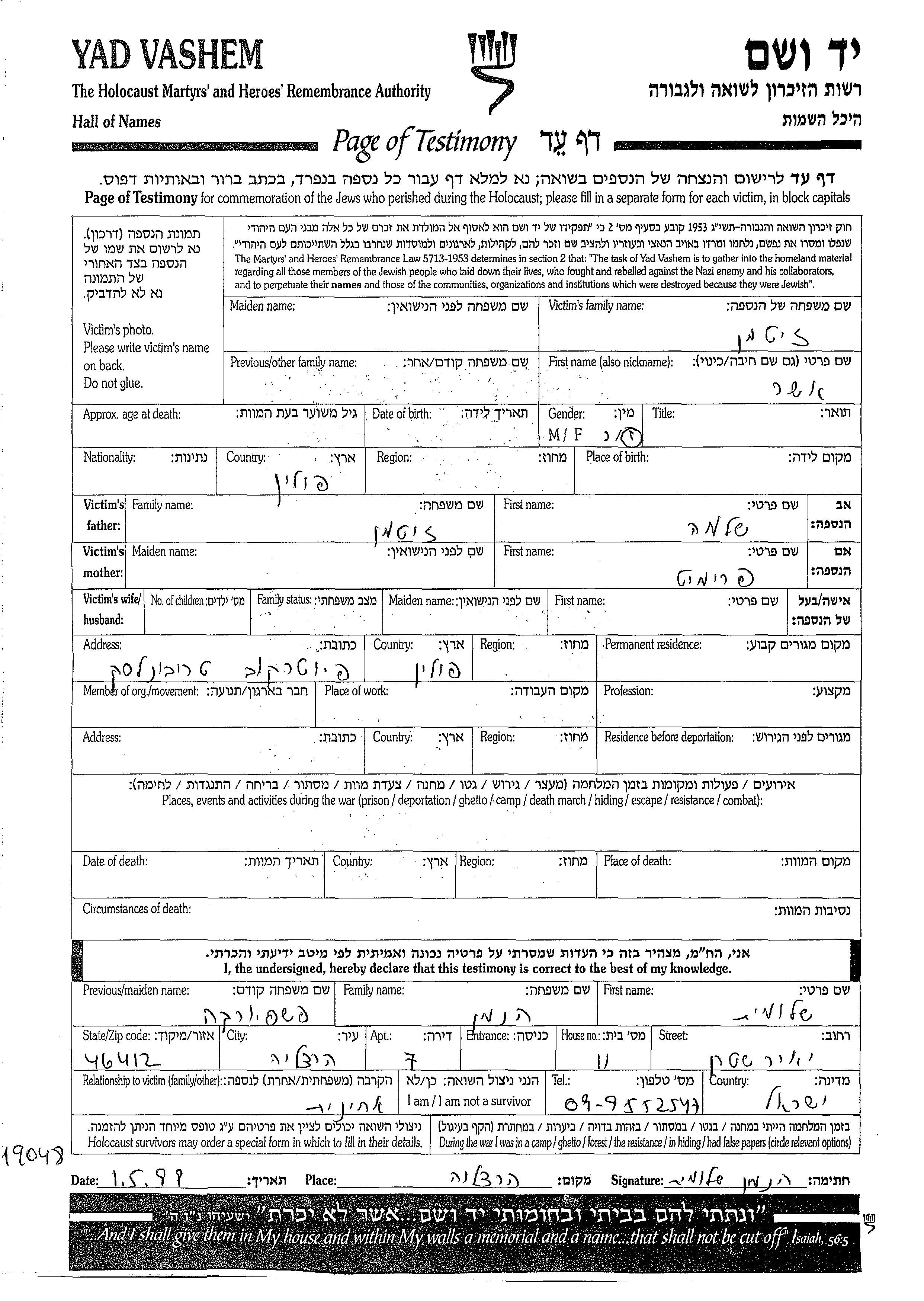 Yad Vashem - Pages of Testimony Names Memorial Collection