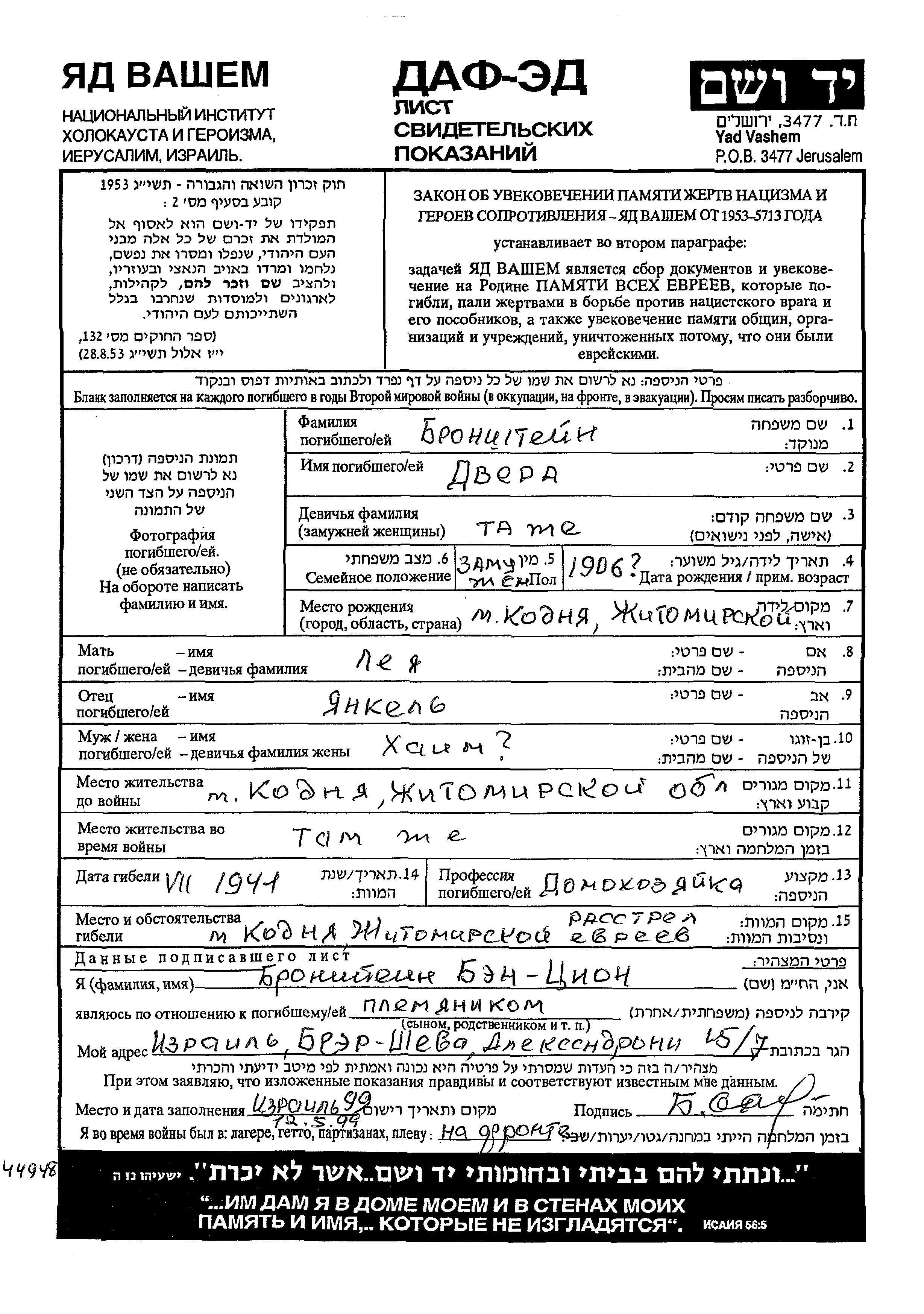 Dvera Bronshtein was born in Kodnia, Ukraine (USSR), 1906 to Yankel and Leya. She was a housewife and married to Khaim. Prior to WWII she lived in Kodnia, Ukraine (USSR). During the war she was in Kodnia, Ukraine (USSR). Dvera was murdered in the Shoah. Place of death: Kodnia, Ukraine (USSR), 07/1941.