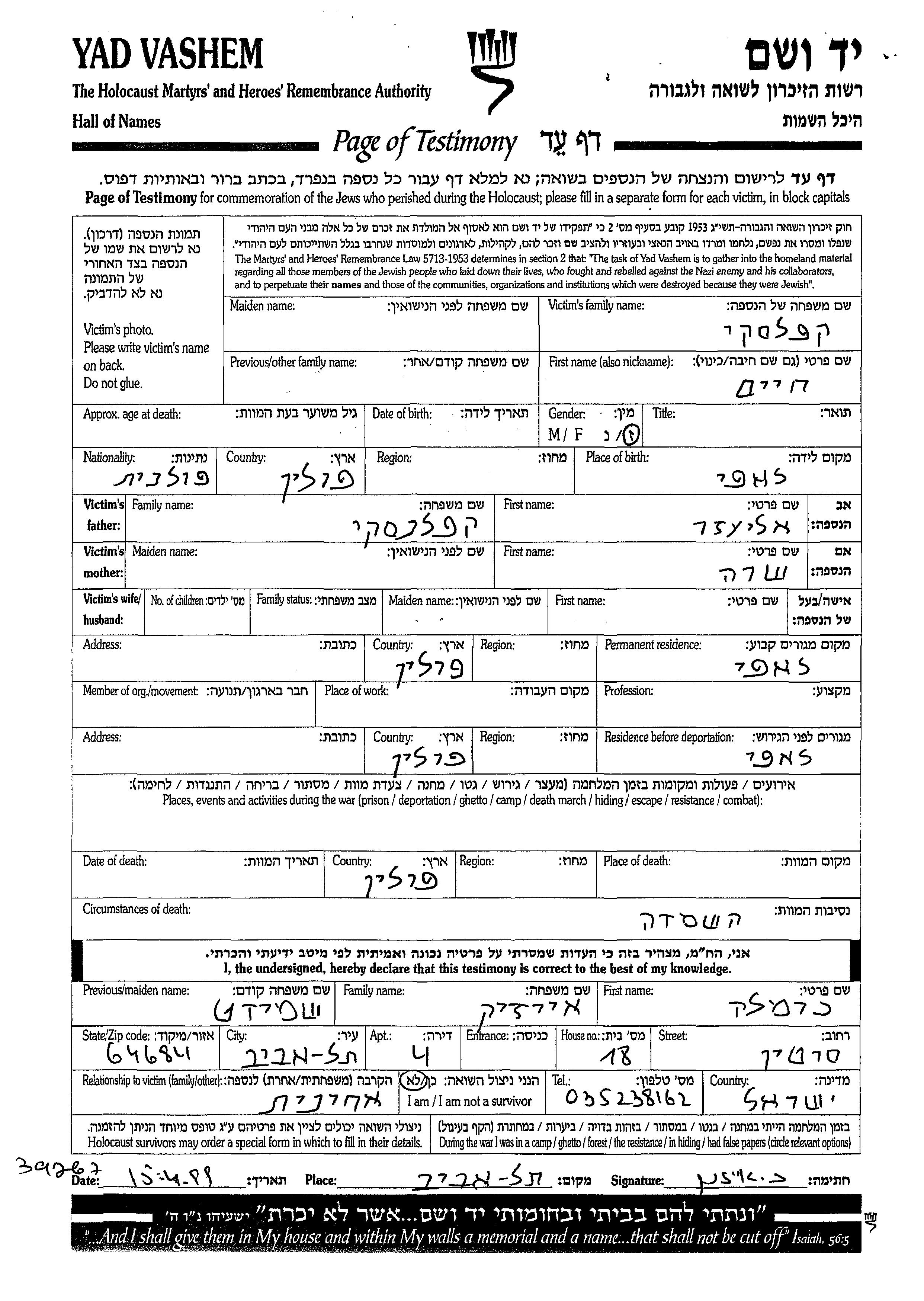 Khaim Kaplanski was born in Łapy, Poland to Eliezer and Sara. Prior to WWII he lived in Łapy, Poland. During the war he was in Łapy, Poland. Khaim was murdered in the Shoah. Place of death: Poland.