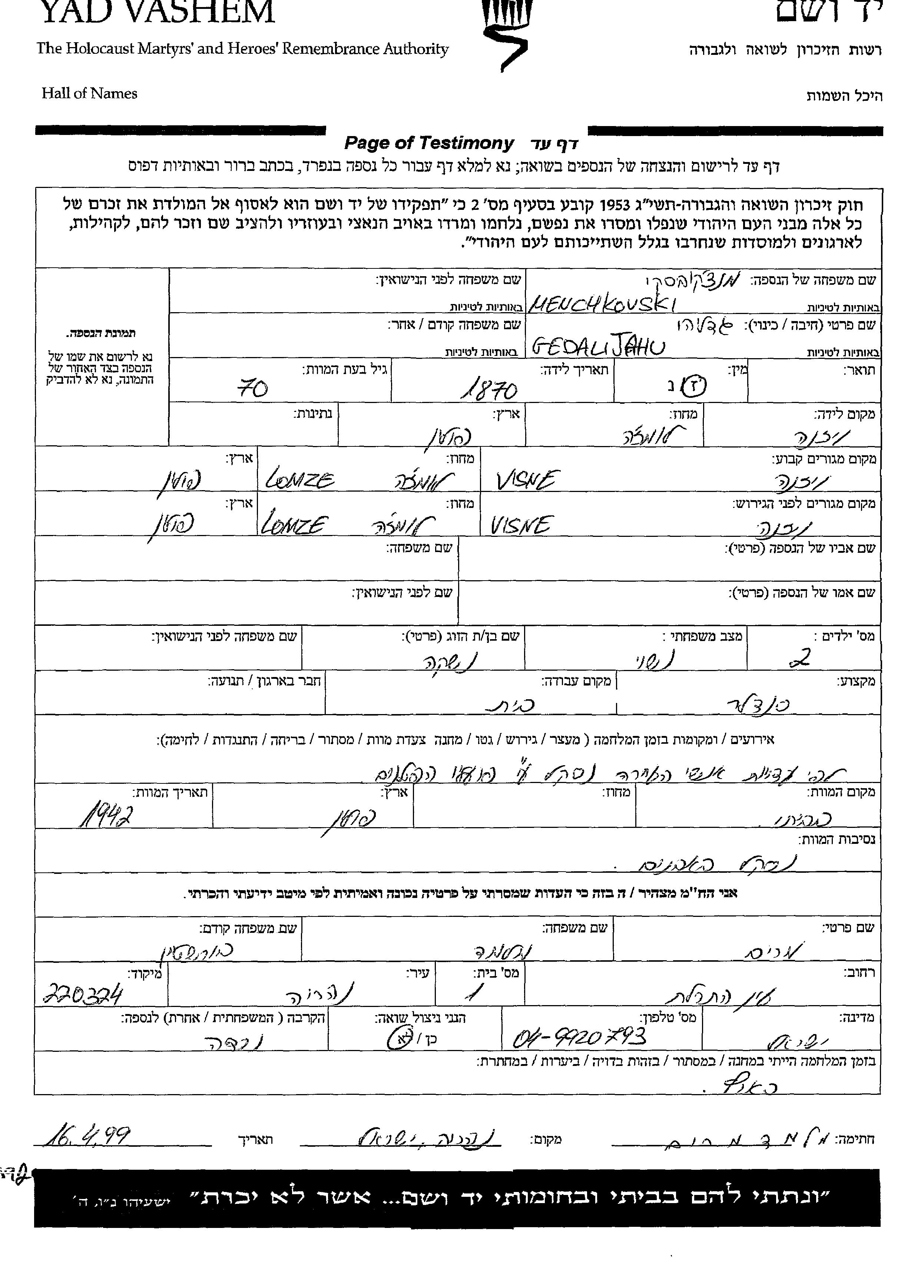 Gedaljahu Menchkovski was born in Wizna, Poland, 1870. He was a shoemaker and married to Neshka. Prior to WWII he lived in Wizna, Poland. During the war he was in Wizna, Poland. Gedaljahu was murdered in the Shoah. Place of death: Wizna, Poland, 1942.