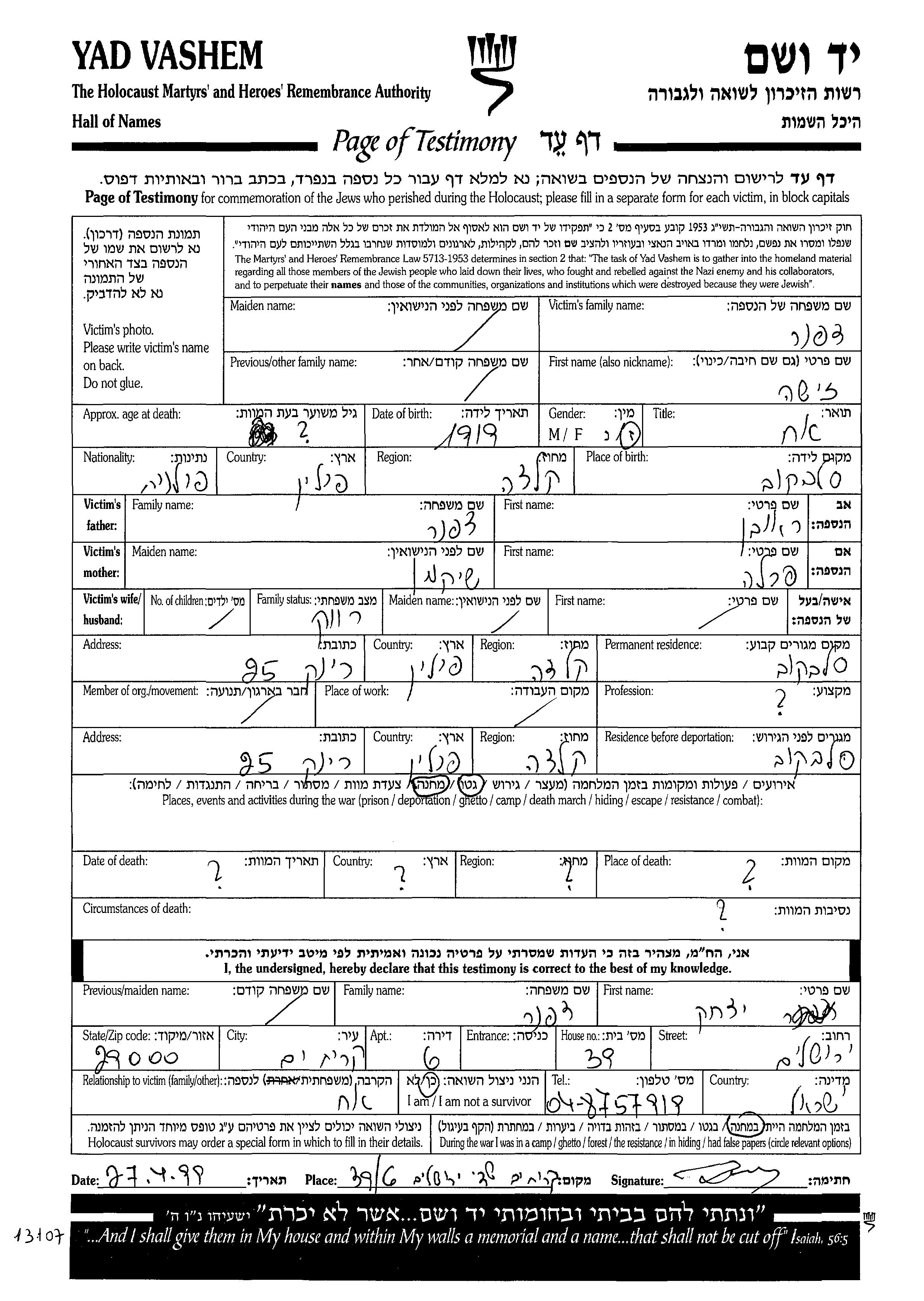 Zisha Dafner was born in Slawkow, Poland, 1919 to Reuven and Perla. He was single. Prior to WWII he lived in Slawkow, Poland. During the war he was in Slawkow, Poland. Zisha was murdered in the Shoah.