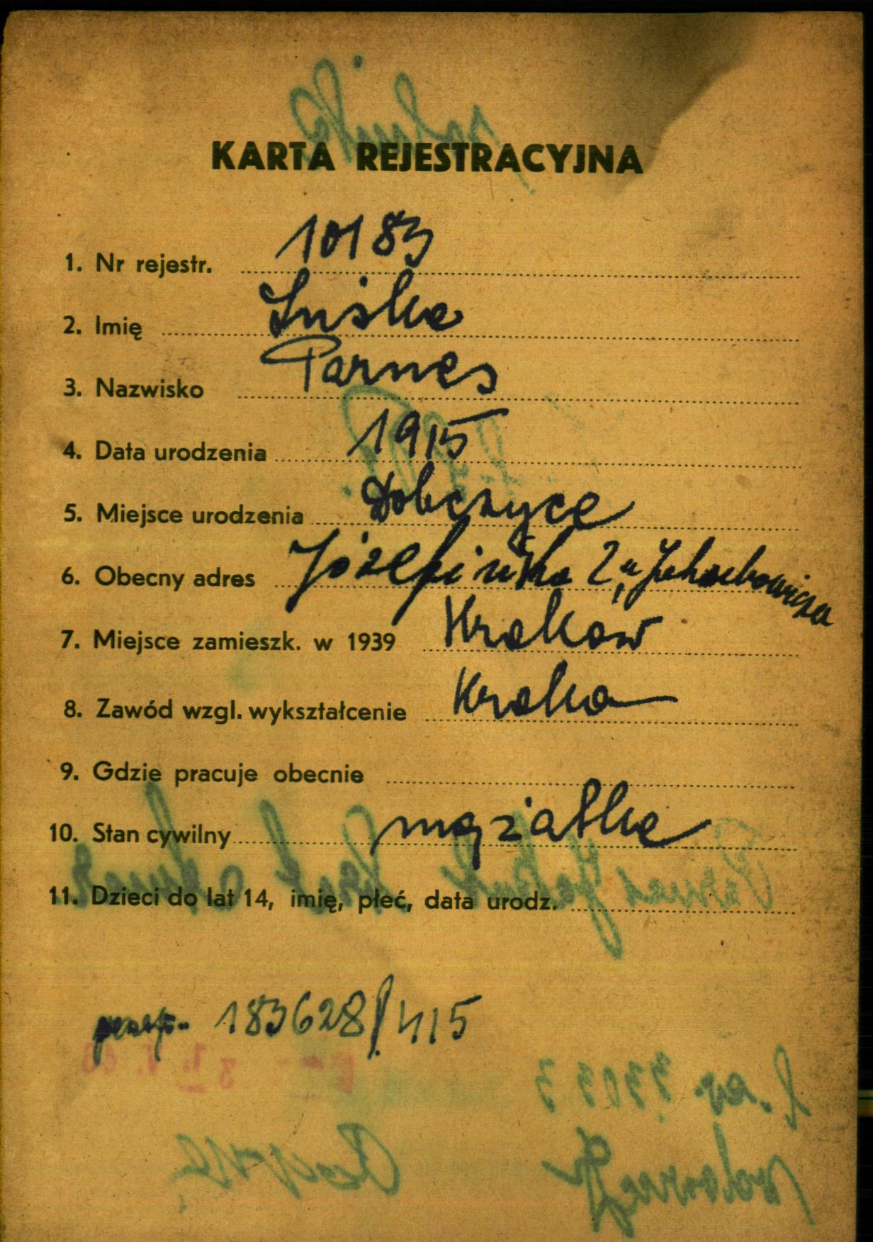 Inśka Parnes was born in Dobczyce, Poland, 1915. She was married. Prior to WWII she lived in Krakow, Poland.