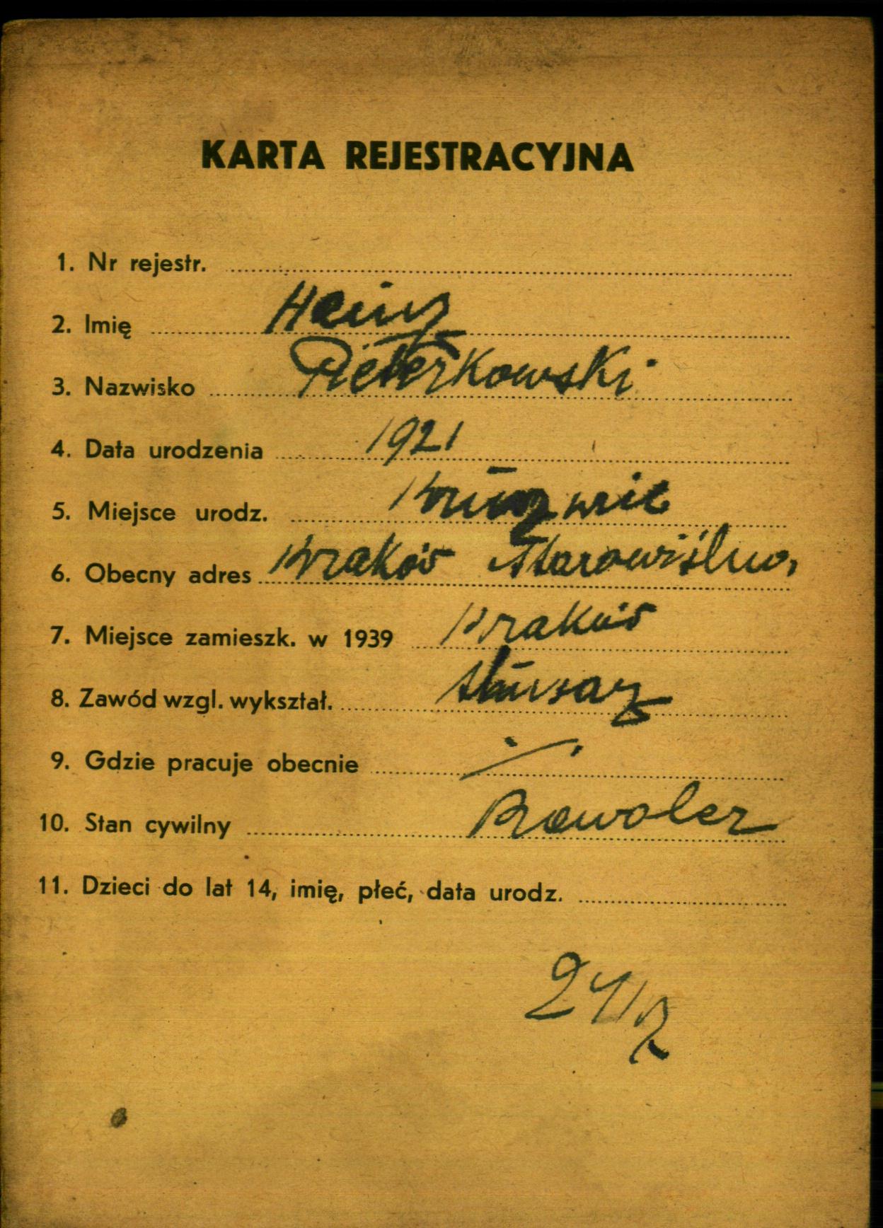 Heins Pieterkowski was born in Kruszwica, Poland, 1921. He was a metalworker and single. Prior to WWII he lived in Krakow, Poland.
