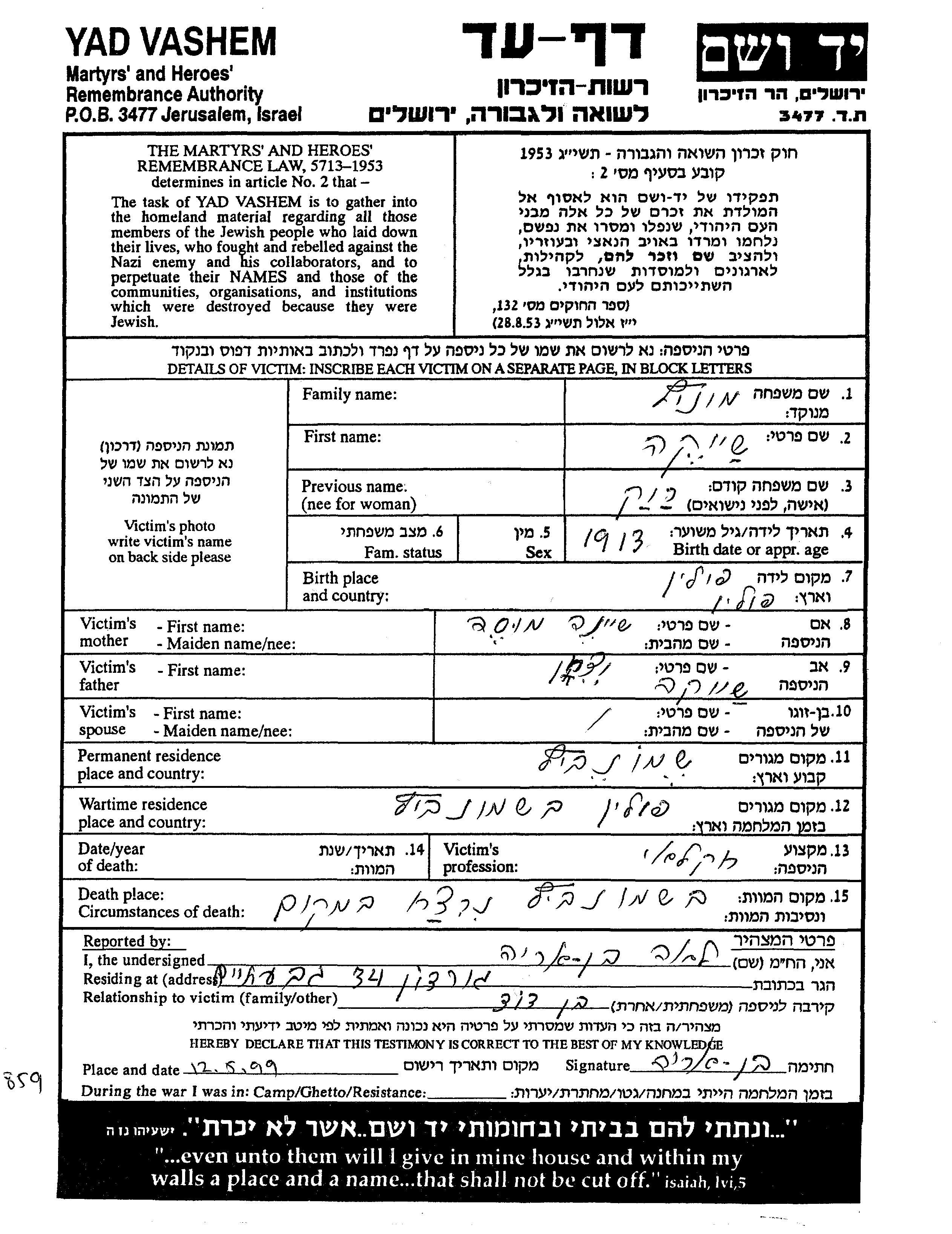 Shaike Munitz was born in Poland, 1913 to Shaike Itzko and Sheind Musa. He was an agriculturist. Prior to WWII he lived in Siemionowicze, Poland. During the war he was in Siemionowicze, Poland. Shaike was murdered in the Shoah. Place of death: Siemionowicze, Poland.