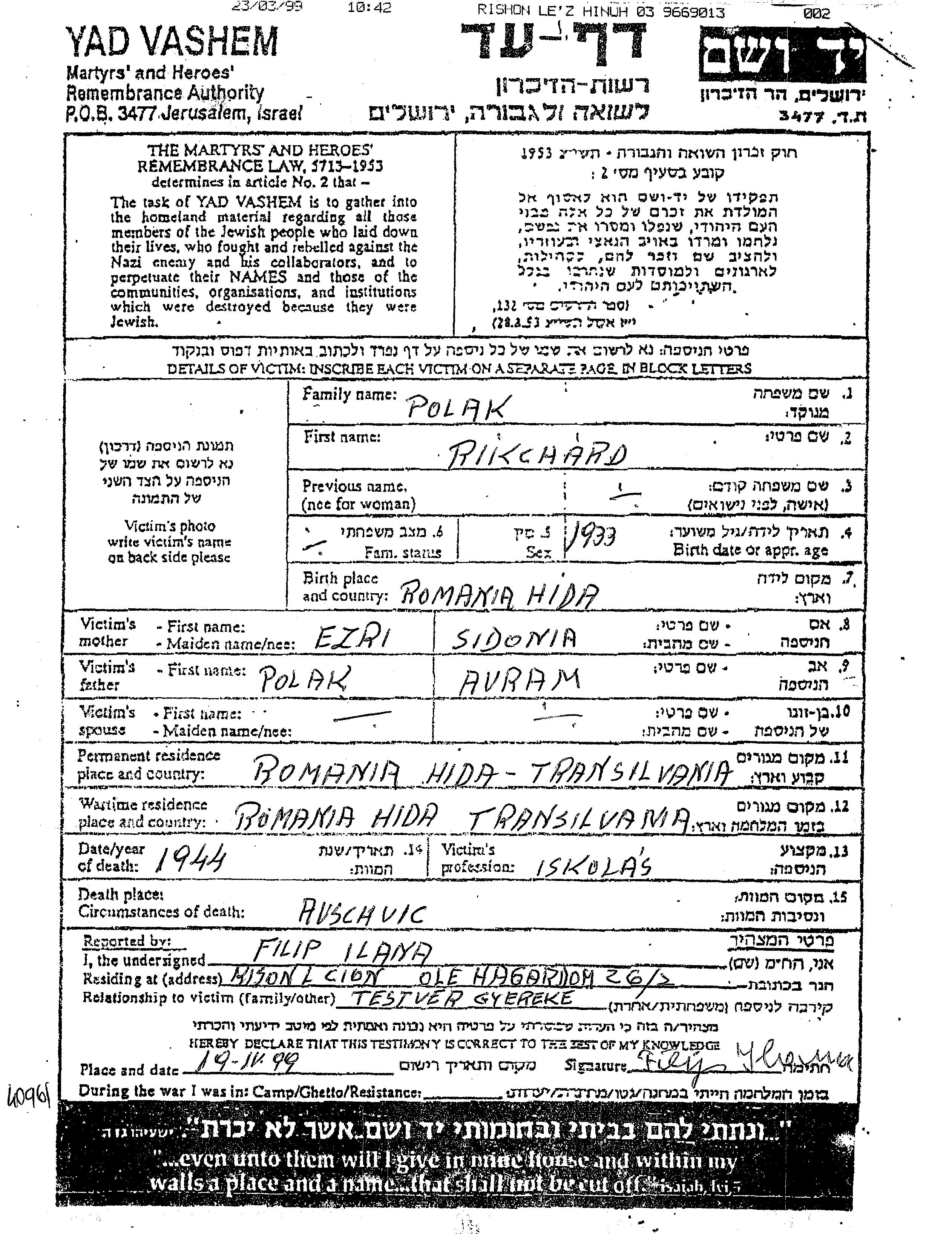 Polak Richard 1933 Hida, Romania Page of Testimony