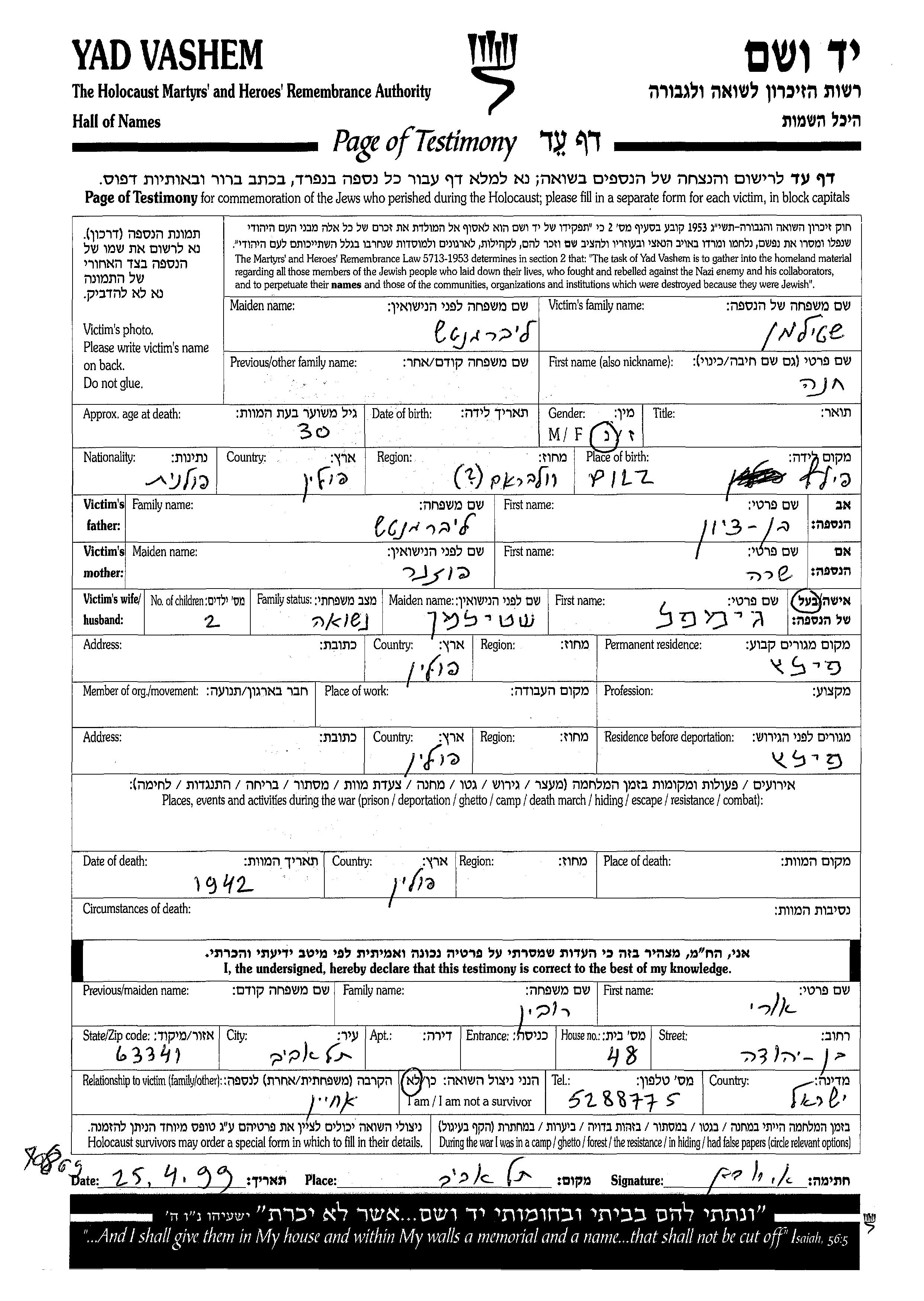 Khana Shtilman nee Libermensh was born in Pilica, Poland to Bentzion and Sara. She was married to Gimpel nee Shtilman. Prior to WWII she lived in Pilica, Poland. During the war she was in Pilica, Poland. Khana was murdered in the Shoah. Place of death: Poland, 1942.