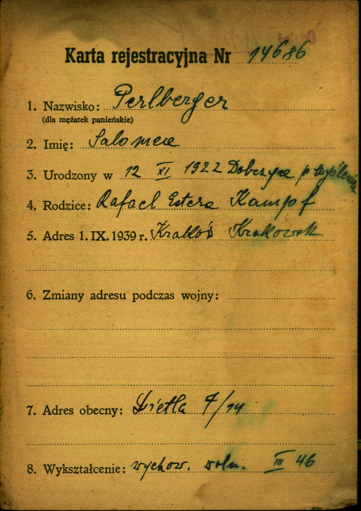 Salomea Perlberger was born in Dobczyce, Poland, 1922 to Rafael and Estera. Prior to WWII she lived in Krakow, Poland.