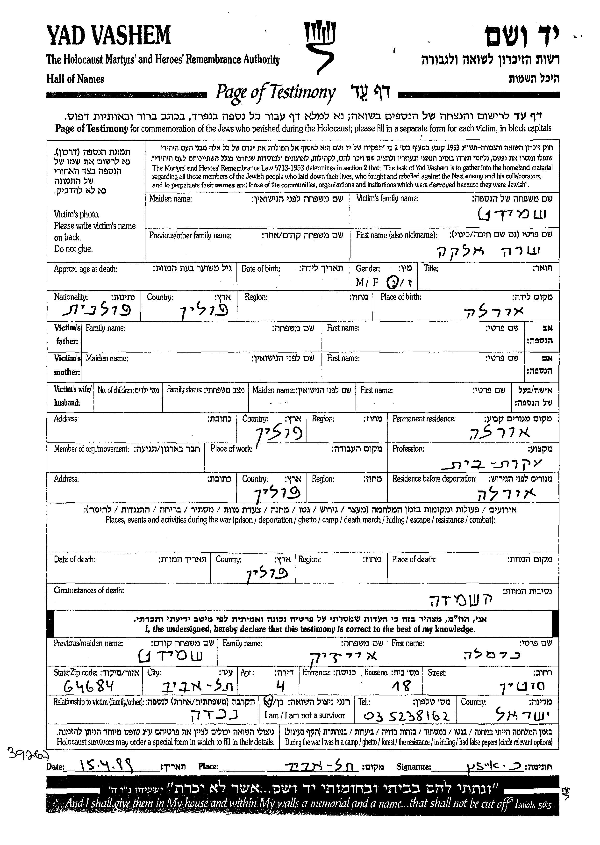 Sara Elka Shmidt was born in Orla, Poland. She was a housewife. Prior to WWII she lived in Orla, Poland. During the war she was in Orla, Poland. Sara Elka was murdered in the Shoah. Place of death: Poland.