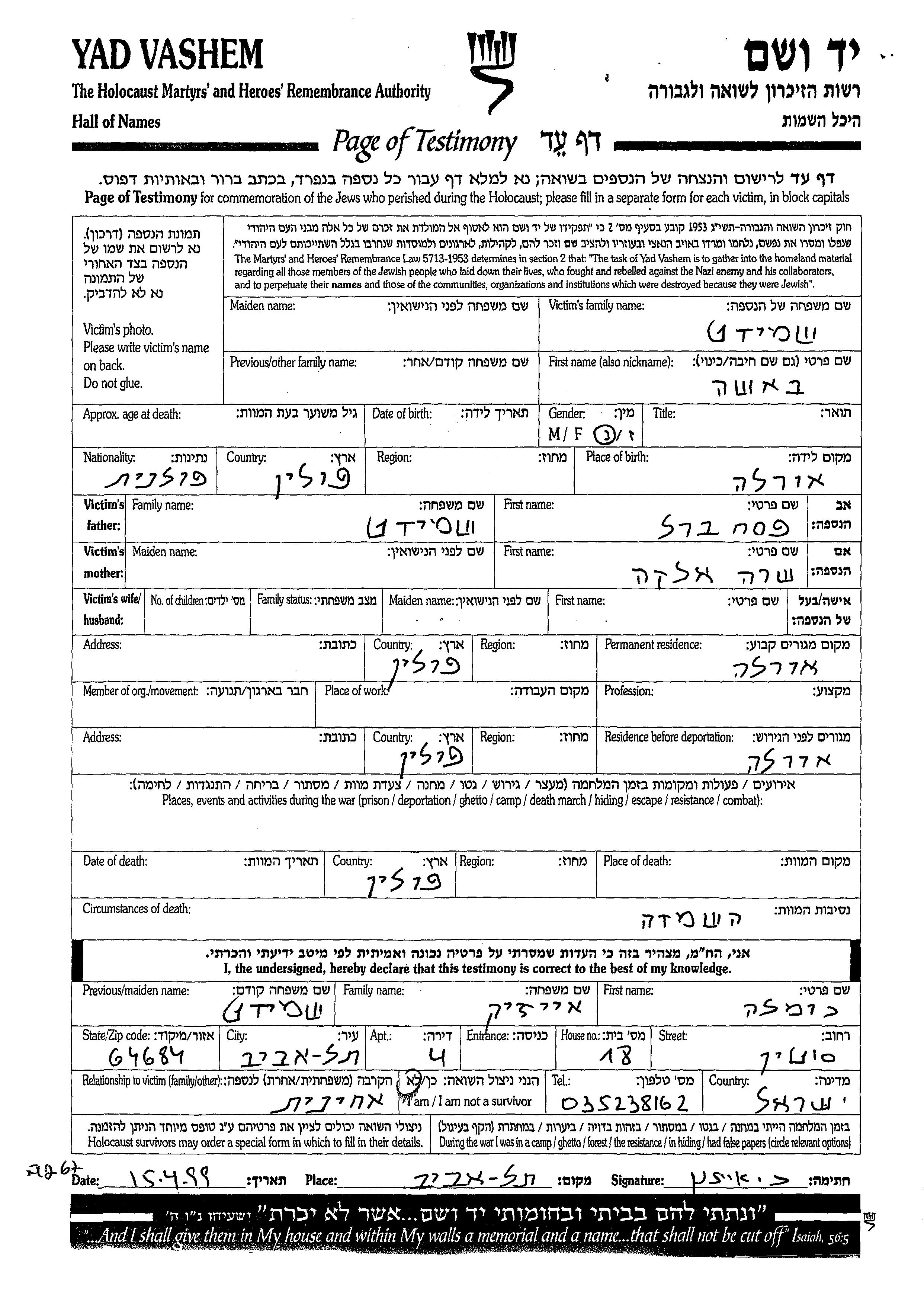 Basha Shmidt was born in Orla, Poland to Pesakh Berl and Sara Elka. Prior to WWII she lived in Orla, Poland. During the war she was in Orla, Poland. Basha was murdered in the Shoah. Place of death: Poland.