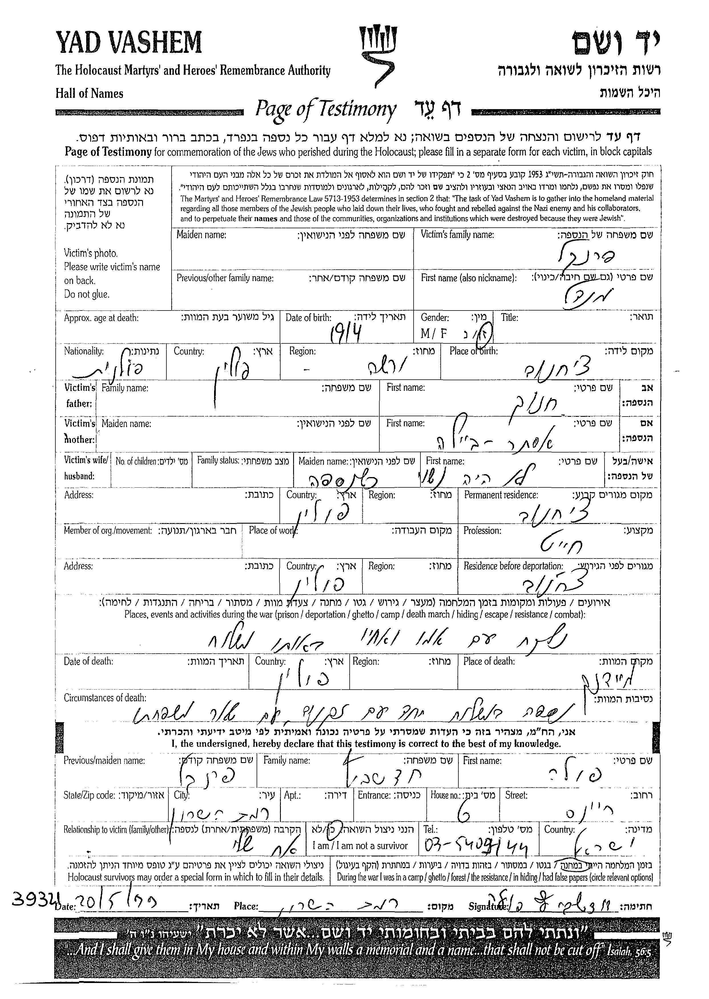 Mendel Frenkel was born in Ciechanow, Poland, 1914 to Khanokh and Ester Beila. He was a tailor. Prior to WWII he lived in Ciechanow, Poland. During the war he was in Ciechanow, Poland. Mendel was murdered in the Shoah. Place of death: Majdanek, Poland.