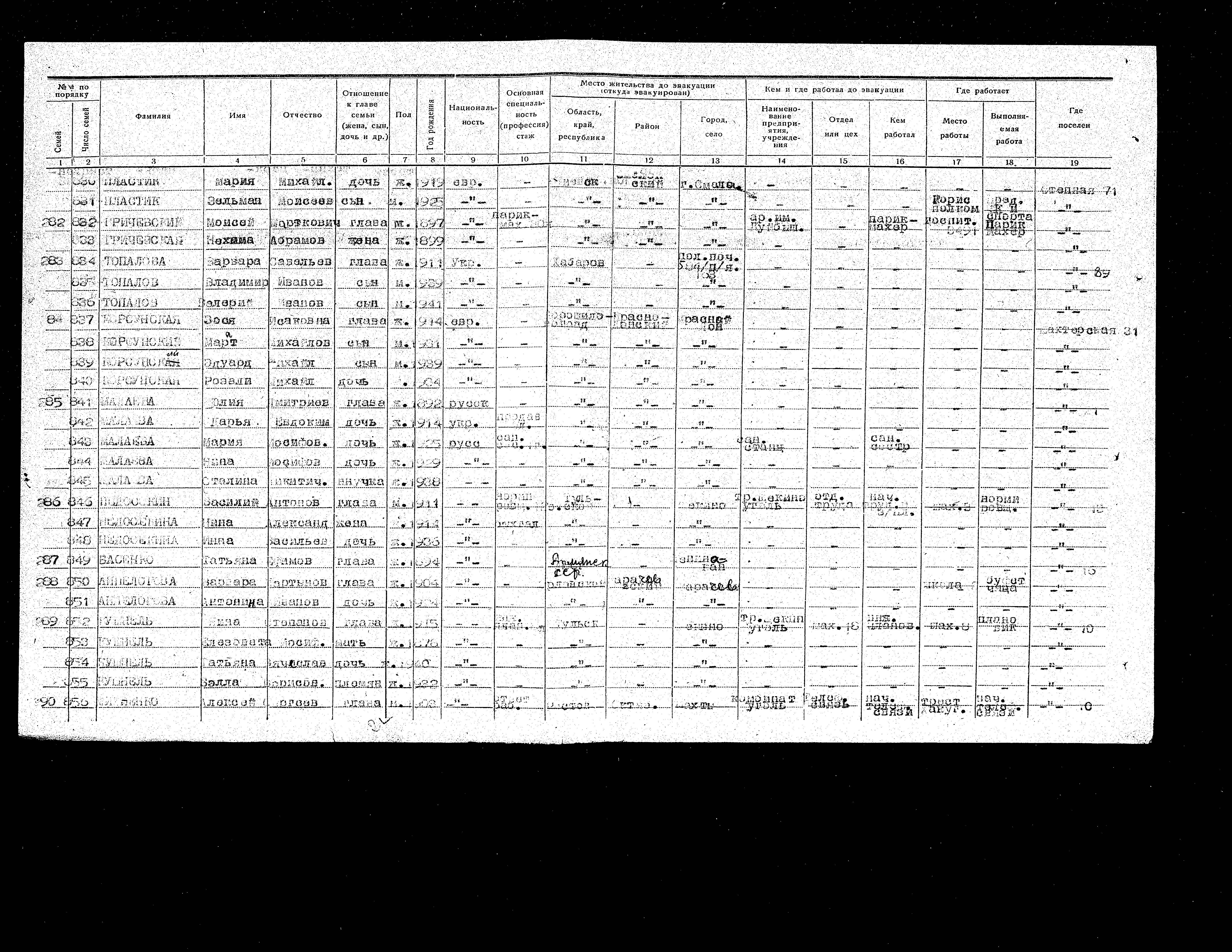 Zosya Korsunskaya was born, 1914 to Isak. Prior to WWII she lived in Krasnodon, Ukraine (USSR). During the war she was in Chernogorsk, Russia (USSR). Zosya was registered following the evacuation/ in the interior of the Soviet Union.