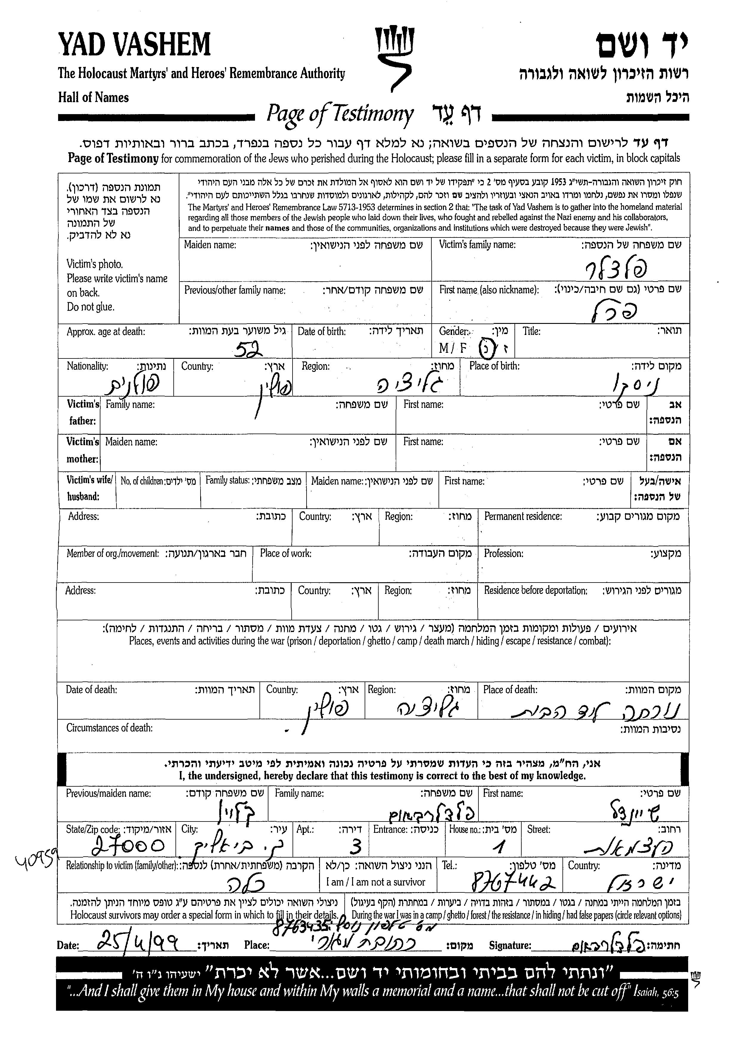 Yad Vashem - Pages of Testimony Names Memorial Collection