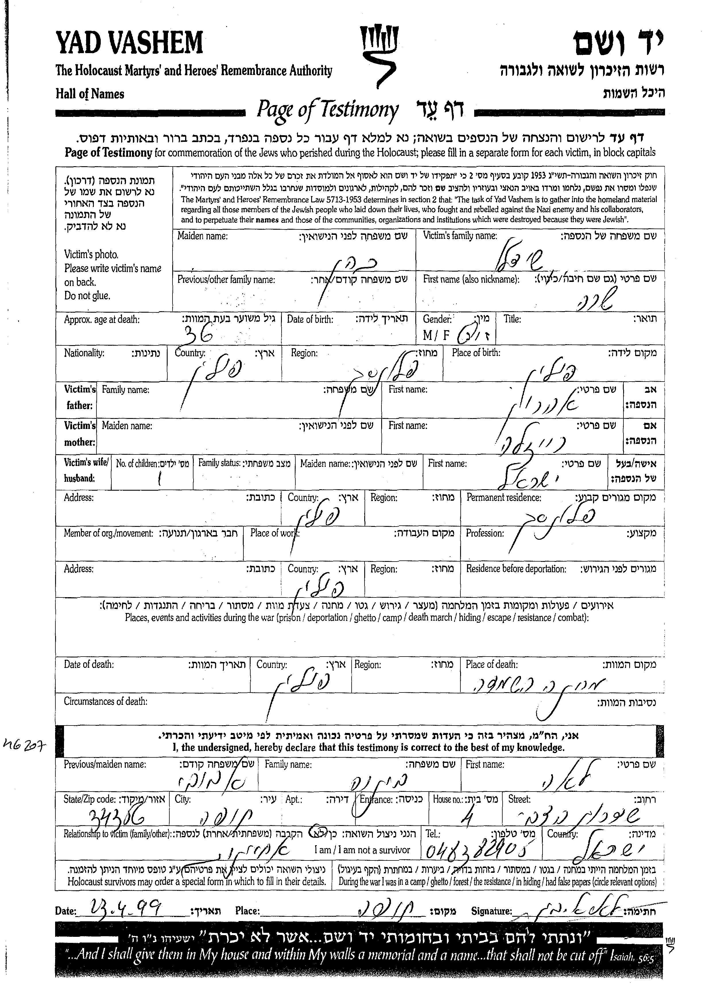 Sara Shidlo nee Kohen was born in Plonsk, Poland to Aharon and Raizla. Prior to WWII she lived in Plonsk, Poland. During the war she was in Poland. Sara was murdered in the Shoah. Place of death: Camp, Poland.