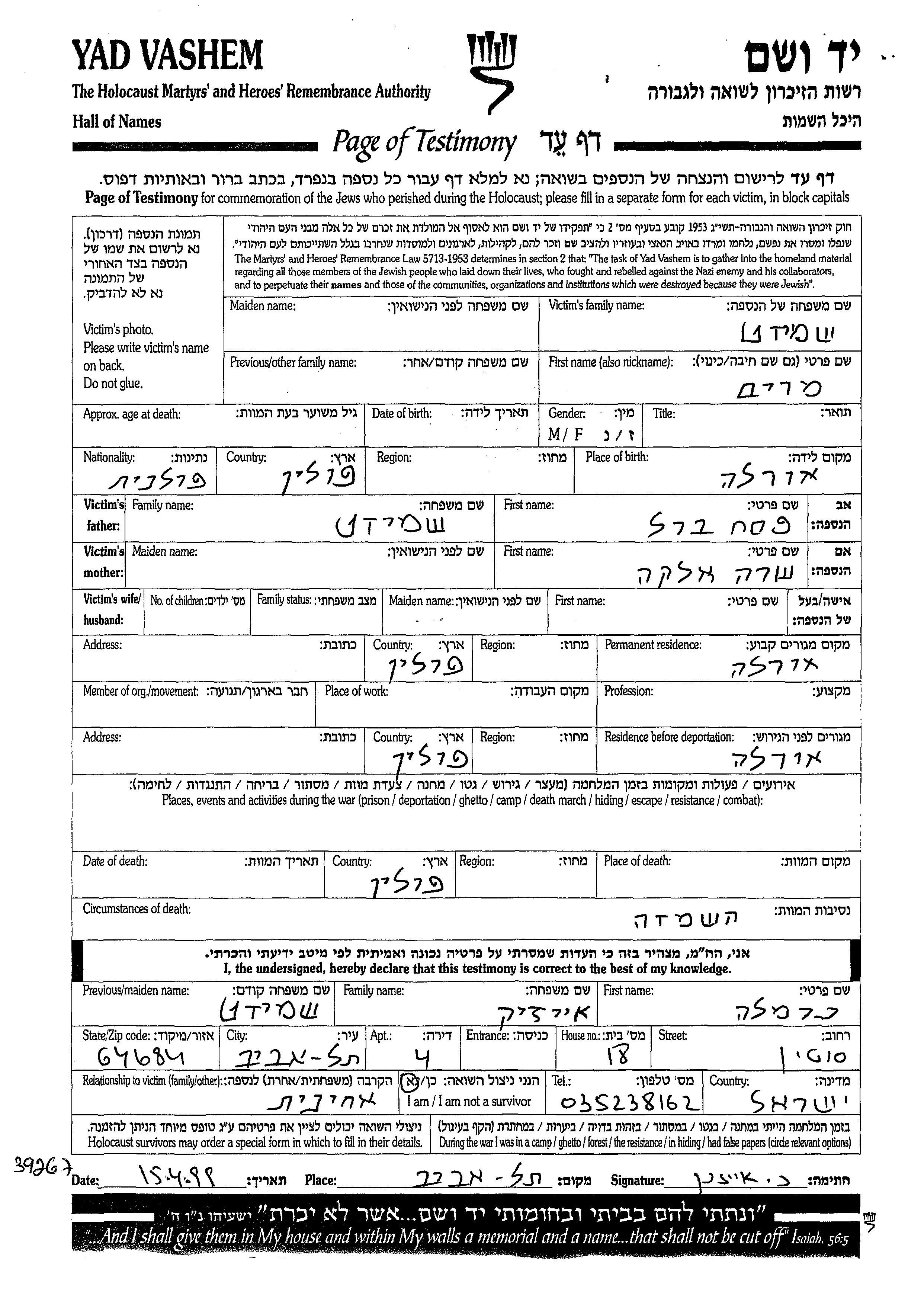 Miriam Shmidt was born in Orla, Poland to Pesakh Berl and Sara Elka. Prior to WWII she lived in Orla, Poland. During the war she was in Orla, Poland. Miriam was murdered in the Shoah. Place of death: Poland.