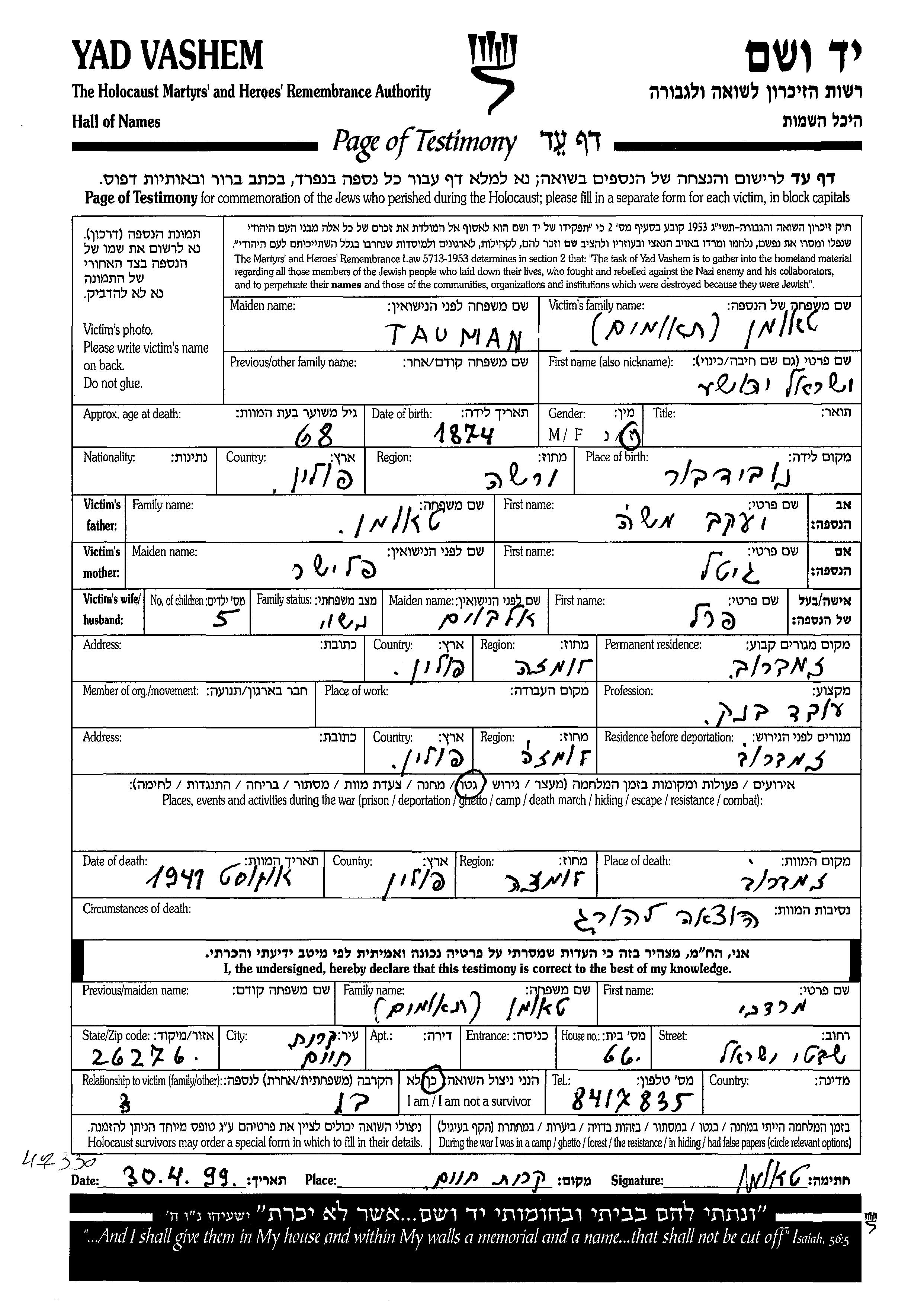 Yisrael Yehoshua Tauman Teomim was born in Nowy Dwor Mazowiecki, Poland, 1874 to Yaakov Moshe and Gitel. He was a bank employee and married to Perel nee Elboim. Prior to WWII he lived in Zambrov, Poland. During the war he was in Zambrov, Poland. Yisrael Yehoshua was murdered in the Shoah. Place of death: Zambrov, Poland, 08/1941.