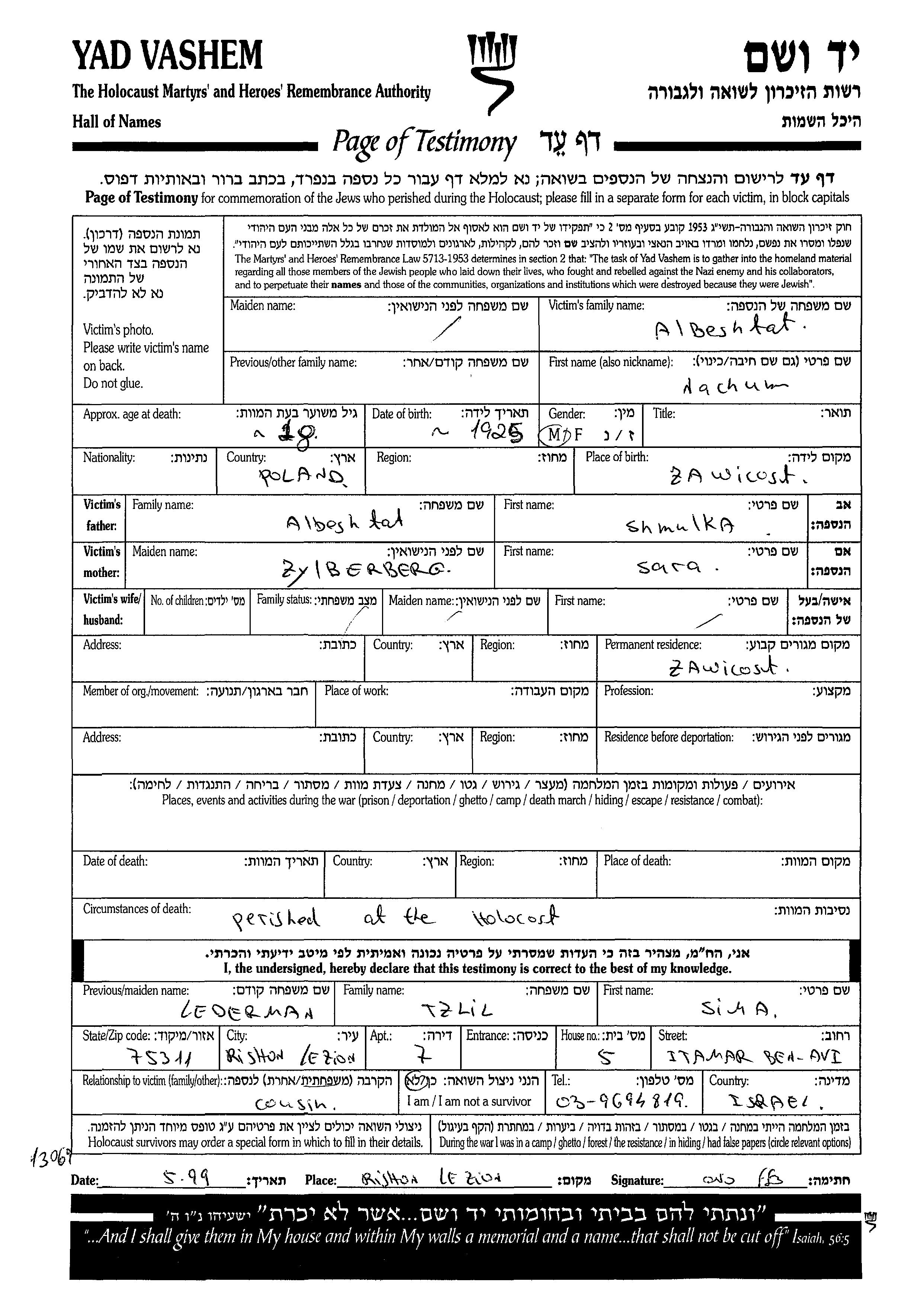 Yad Vashem - Pages of Testimony Names Memorial Collection