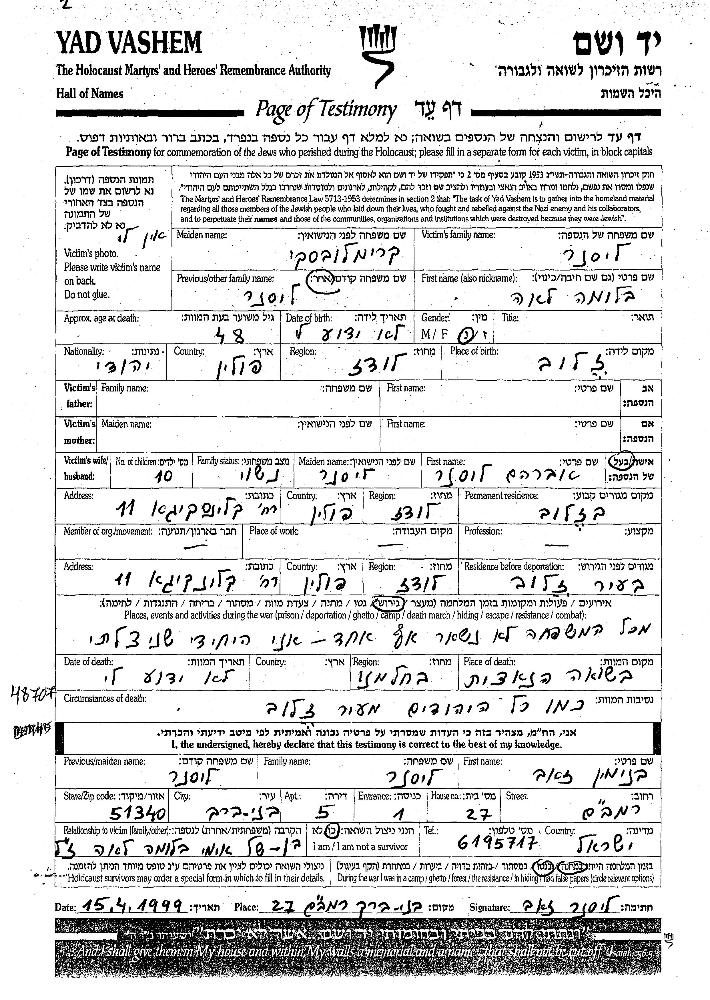 Bluma Lea Lisner nee Krimalovski was born in Zelow, Poland. She was married to Avraham. Prior to WWII she lived in Zelow, Poland. During the war she was in Zelow, Poland. Bluma Lea was murdered in the Shoah. Place of death: Chelmno, Poland.
