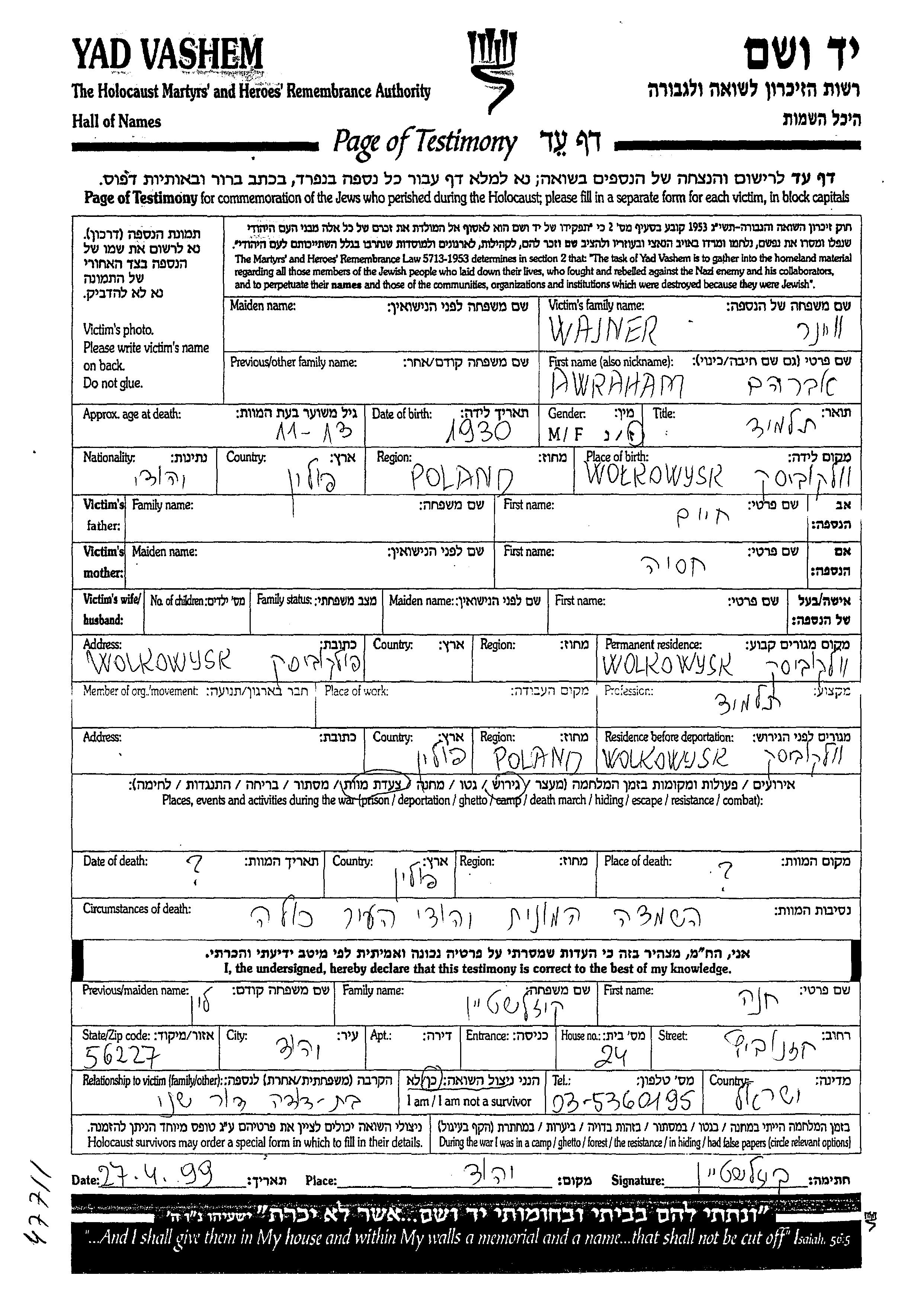 Wajner Awraham 1930 Wolkowysk, Poland Page of Testimony