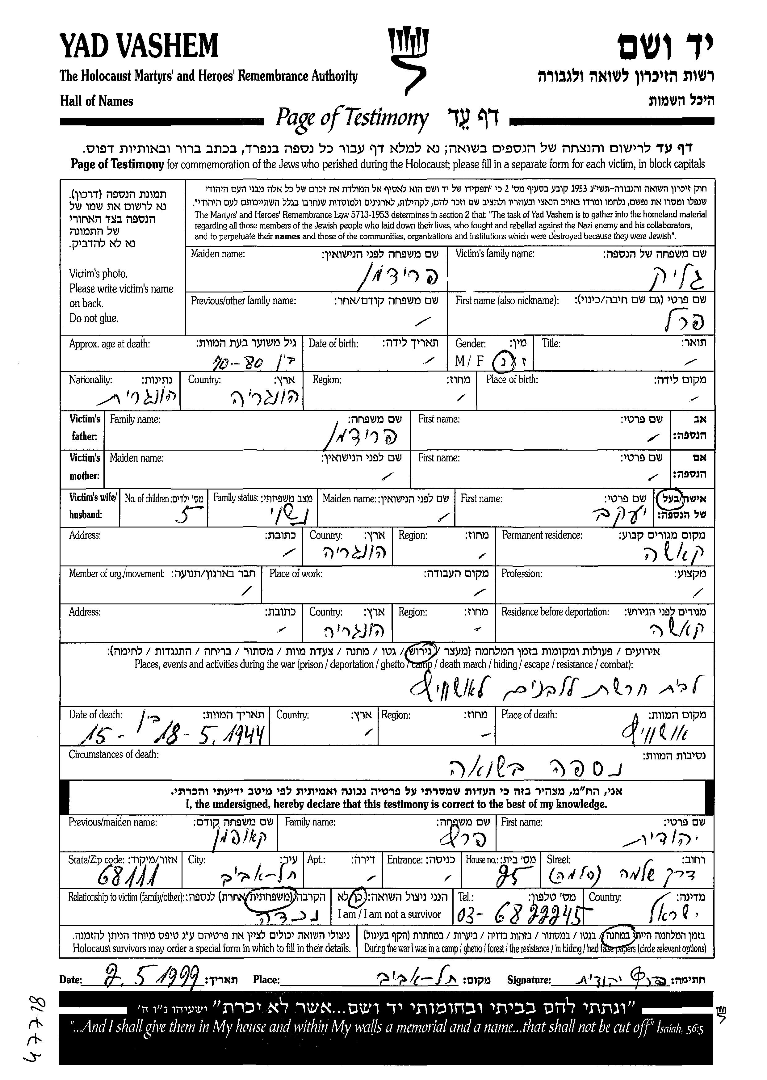 Yad Vashem - Pages of Testimony Names Memorial Collection