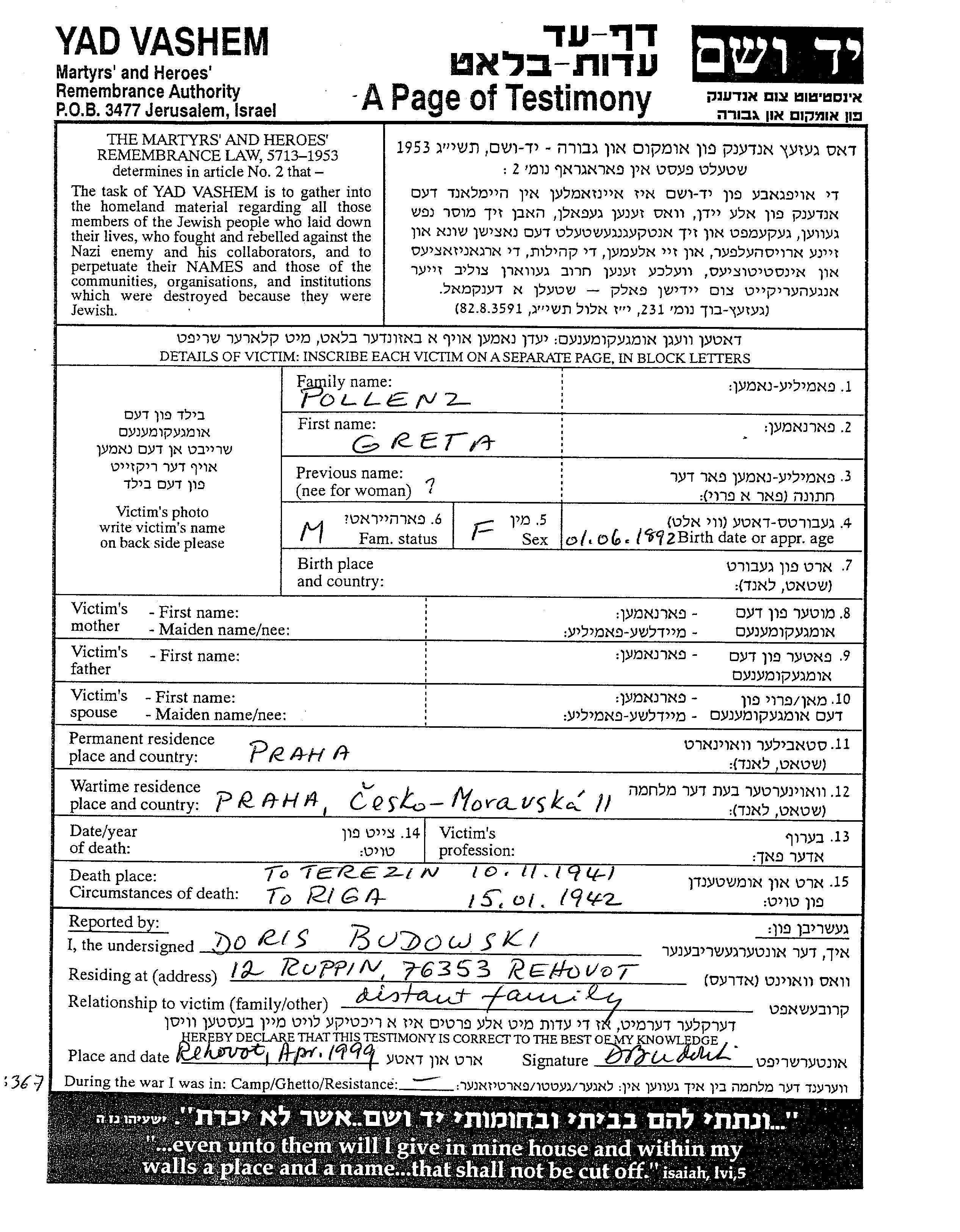Pollenz Greta 1892 Praha, Czechoslovakia Page of Testimony