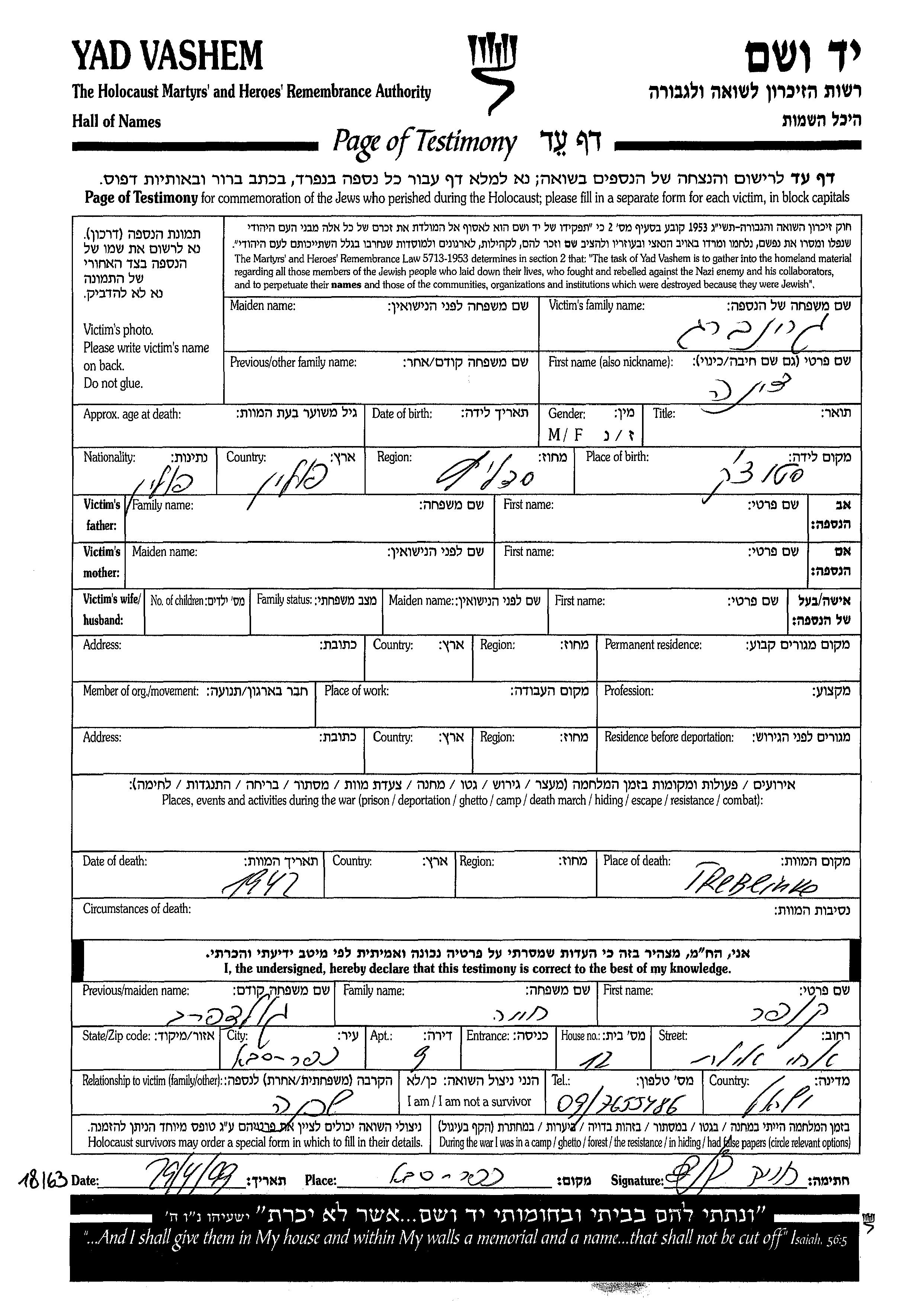 Yad Vashem - Pages of Testimony Names Memorial Collection