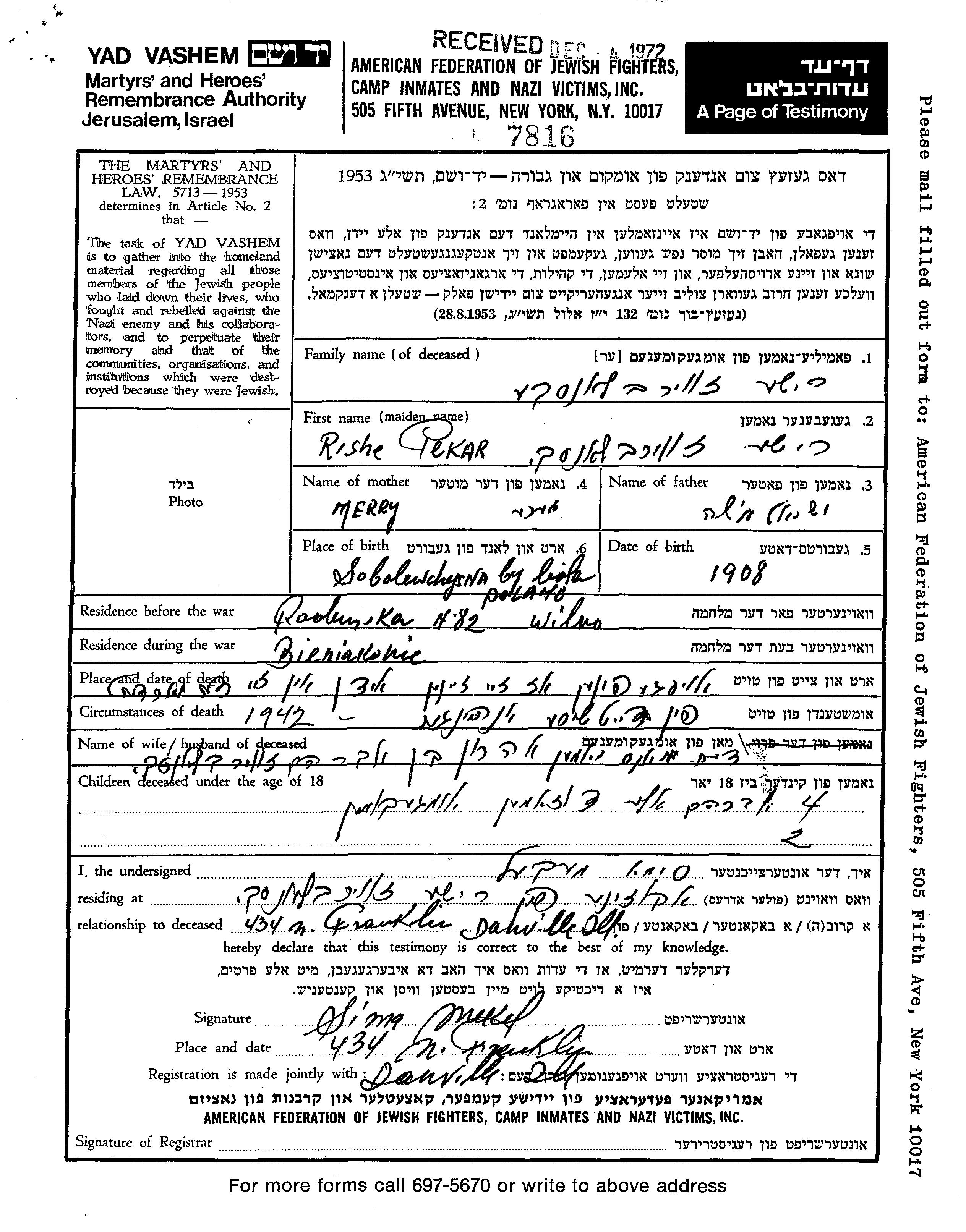 Risha Zvirblonski nee Peker was born in Sobolew, Poland, 1908 to Yisrael Moshe and Merry Mere. She was married to Aharon. Prior to WWII she lived in Wilno, Poland. During the war she was in Bieniakonie, Poland. Risha was murdered in the Shoah. Place of death: unknown, 1942.