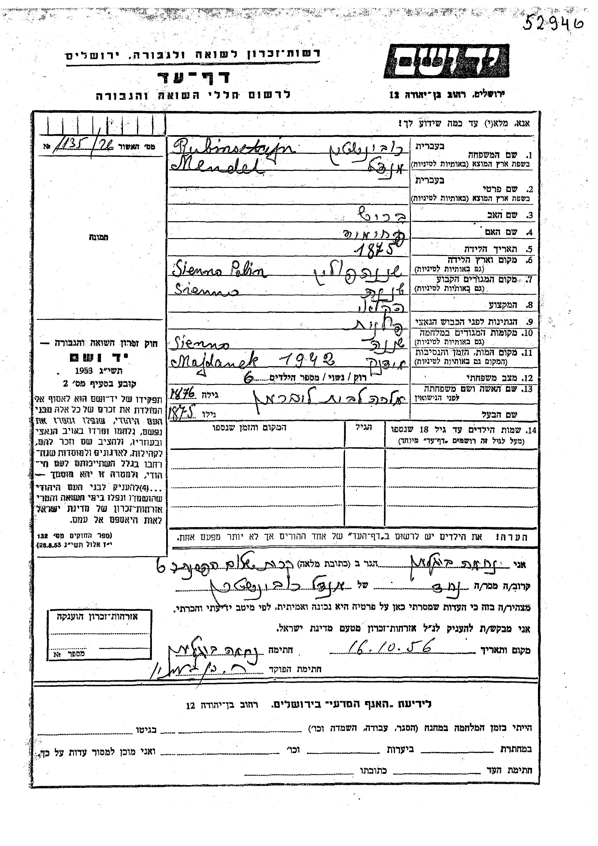 Mendel Rubinsztajn was born in Sienno, Poland, 1875 to Berish and Froymid. He was an agriculturist and married to Malka nee Liberman. Prior to WWII he lived in Sienno, Poland. During the war he was in Sienno, Poland. Mendel was murdered in the Shoah. Place of death: Majdanek, Poland, 1942.
