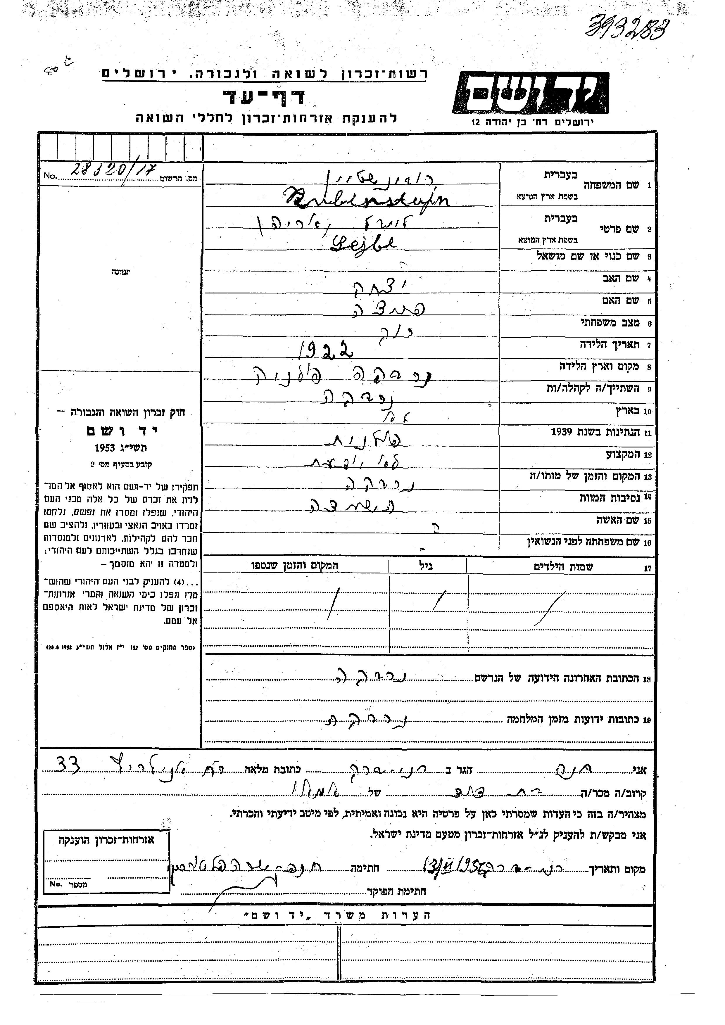 Lejbl Arie Rubinstejn was born in Narewka, Poland, 1922 to Yitzkhak and Frida. He was single. Prior to WWII he lived in Narewka, Poland. During the war he was in Narewka, Poland. Lejbl Arie was murdered in the Shoah. Place of death: Narewka, Poland.