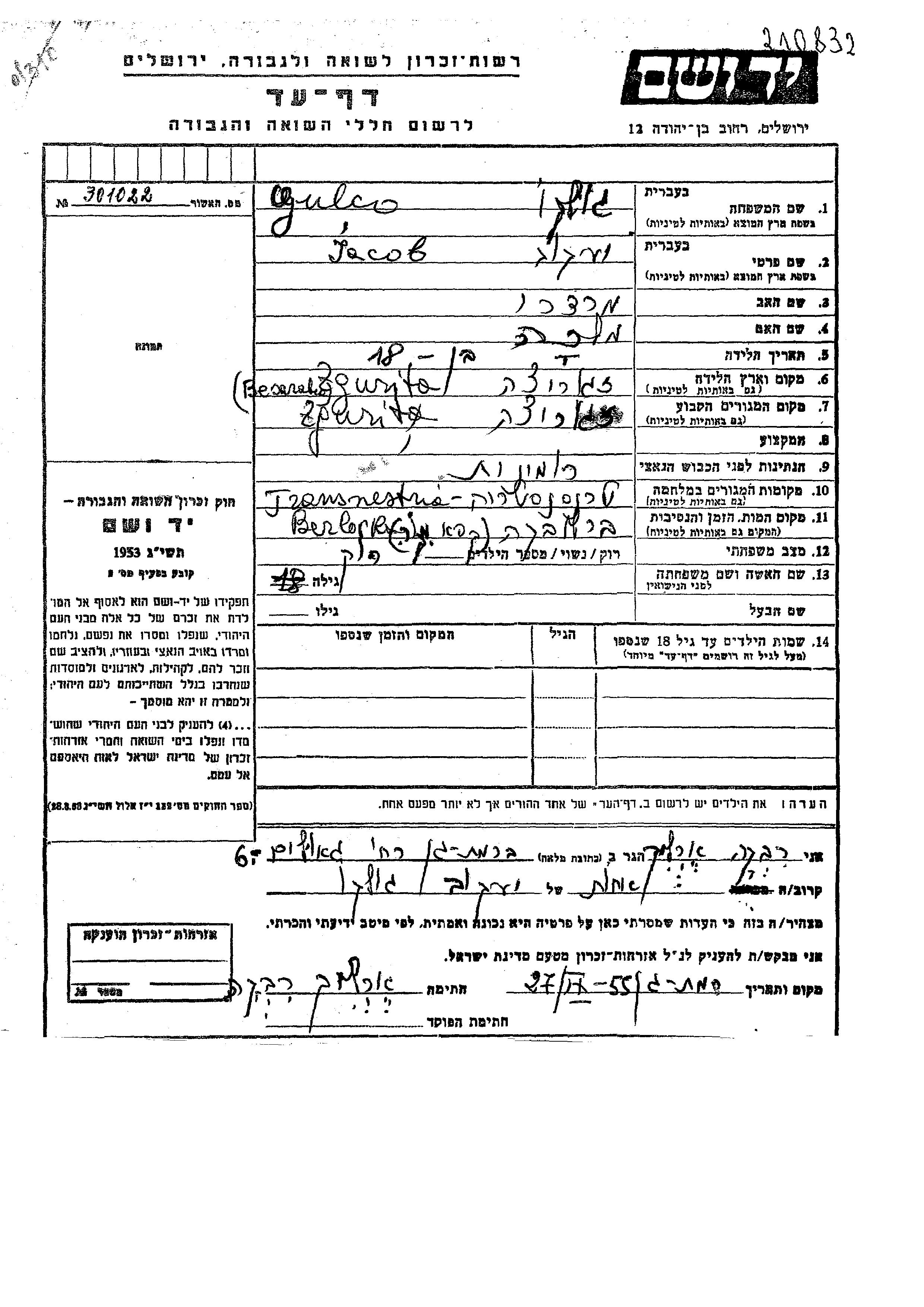 Jacob Gulco was born in Zgaritza, Romania to Mordekhai and Malka. He was single. Prior to WWII he lived in Zgaritza, Romania. During the war he was in Transnistria, Ukraine (USSR). Jacob was murdered in the Shoah. Place of death: Berlovka*, Ukraine (USSR).