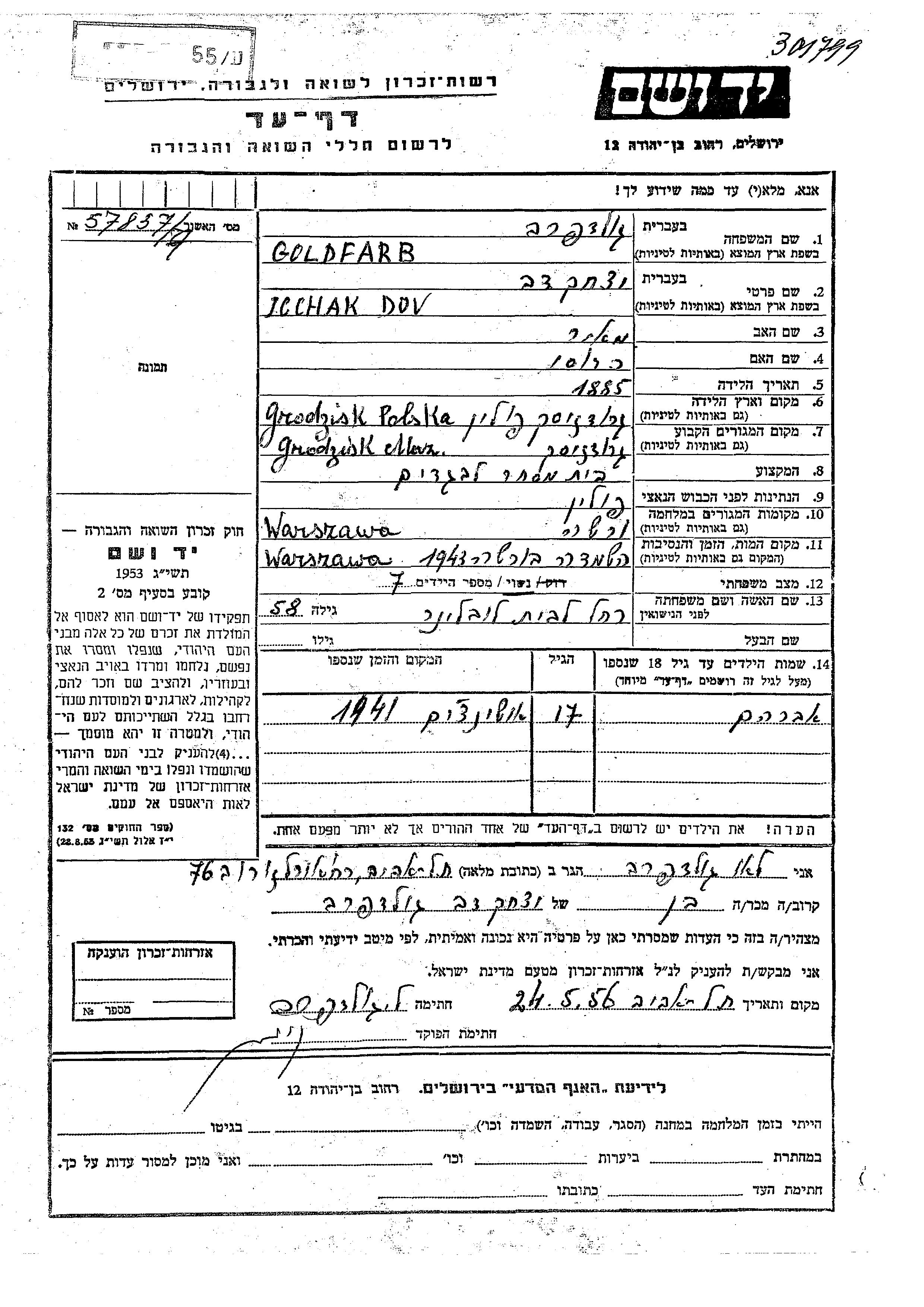 Icchak Dov Goldfarb was born in Grodzisk Mazowiecki, Poland, 1885 to Meir and Harus. He was married to Rakhel nee Lubliner. Prior to WWII he lived in Grodzisk Mazowiecki, Poland. During the war he was in Warszawa, Poland. Icchak Dov was murdered in the Shoah. Place of death: Warszawa, Poland, 1943.