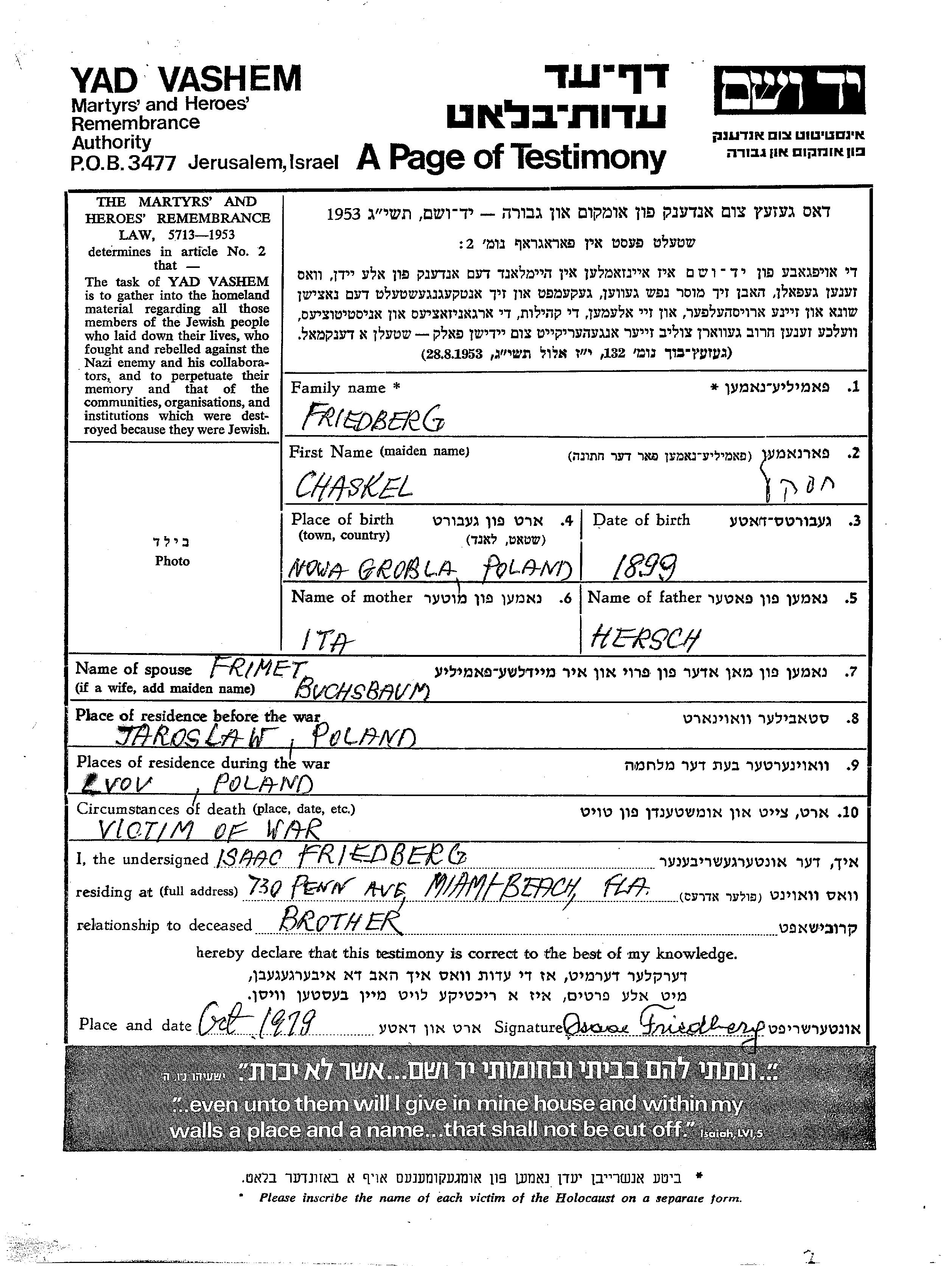 Chaskel Friedberg was born in Nowa Grobla, Poland, 1899 to Hersch and Ita. He was married to Frimet nee Buchsbaum. Prior to WWII he lived in Jaroslav, Poland. During the war he was in Lvov, Poland. Chaskel was murdered in the Shoah.