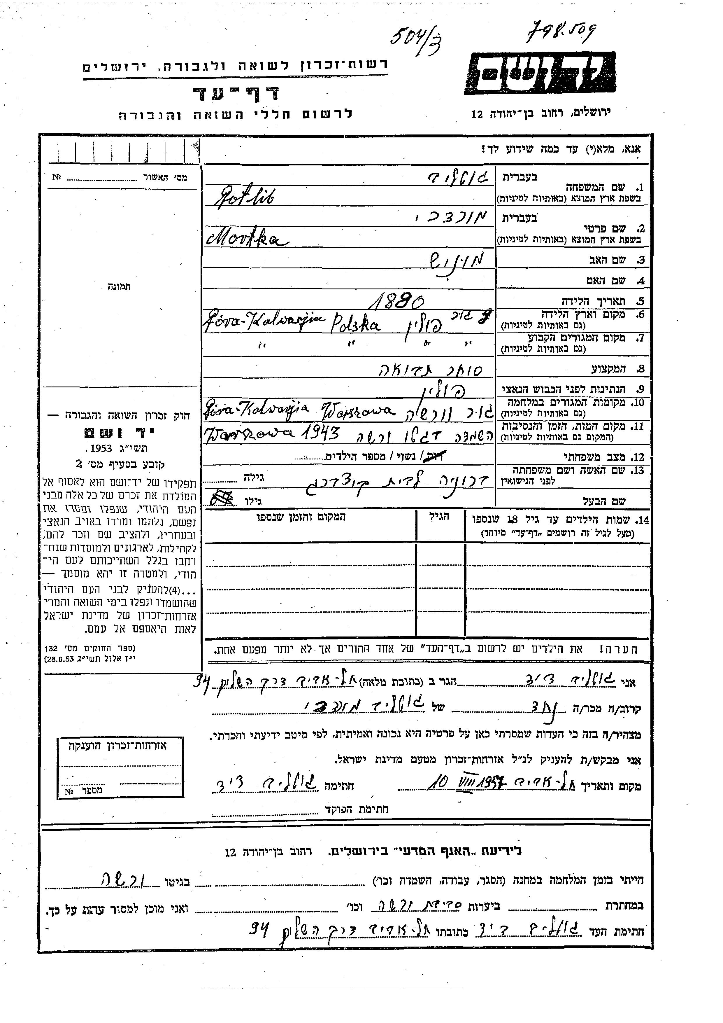Mortka Gotlib was born in Gora Kalwaria, Poland, 1880 to Munish. He was a grain merchant and married to Bronia nee Kutzberg. Prior to WWII he lived in Gora Kalwaria, Poland. During the war he was in Gora Kalwaria, Poland. Mortka was murdered in the Shoah. Place of death: Warsaw, Poland, 1943.