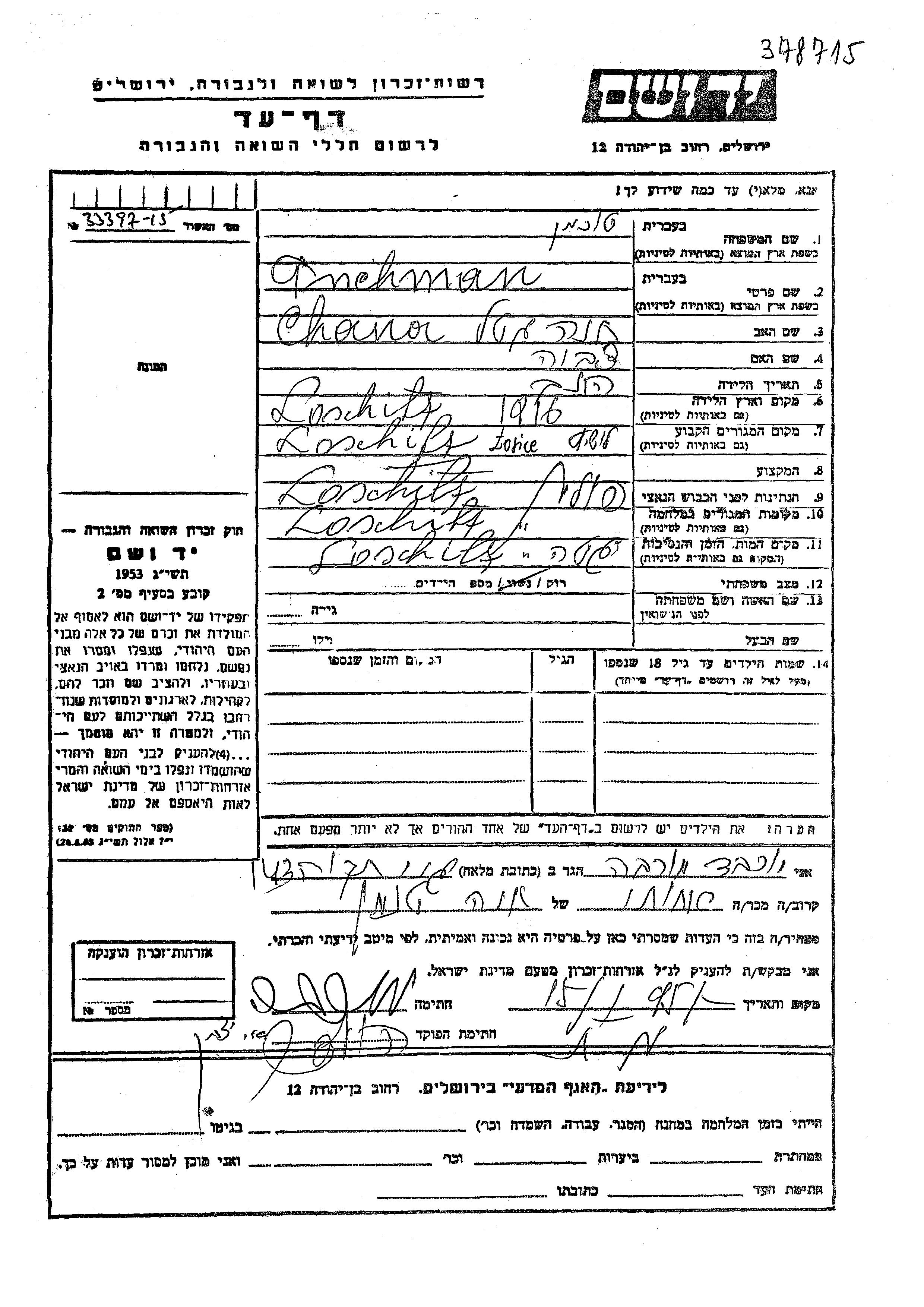 Chana Getel Tuchman was born in Losice, Poland, 1916 to Tzvia. She was single. Prior to WWII she lived in Losice, Poland. During the war she was in Losice, Poland. Chana Getel was murdered in the Shoah. Place of death: Losice, Poland.