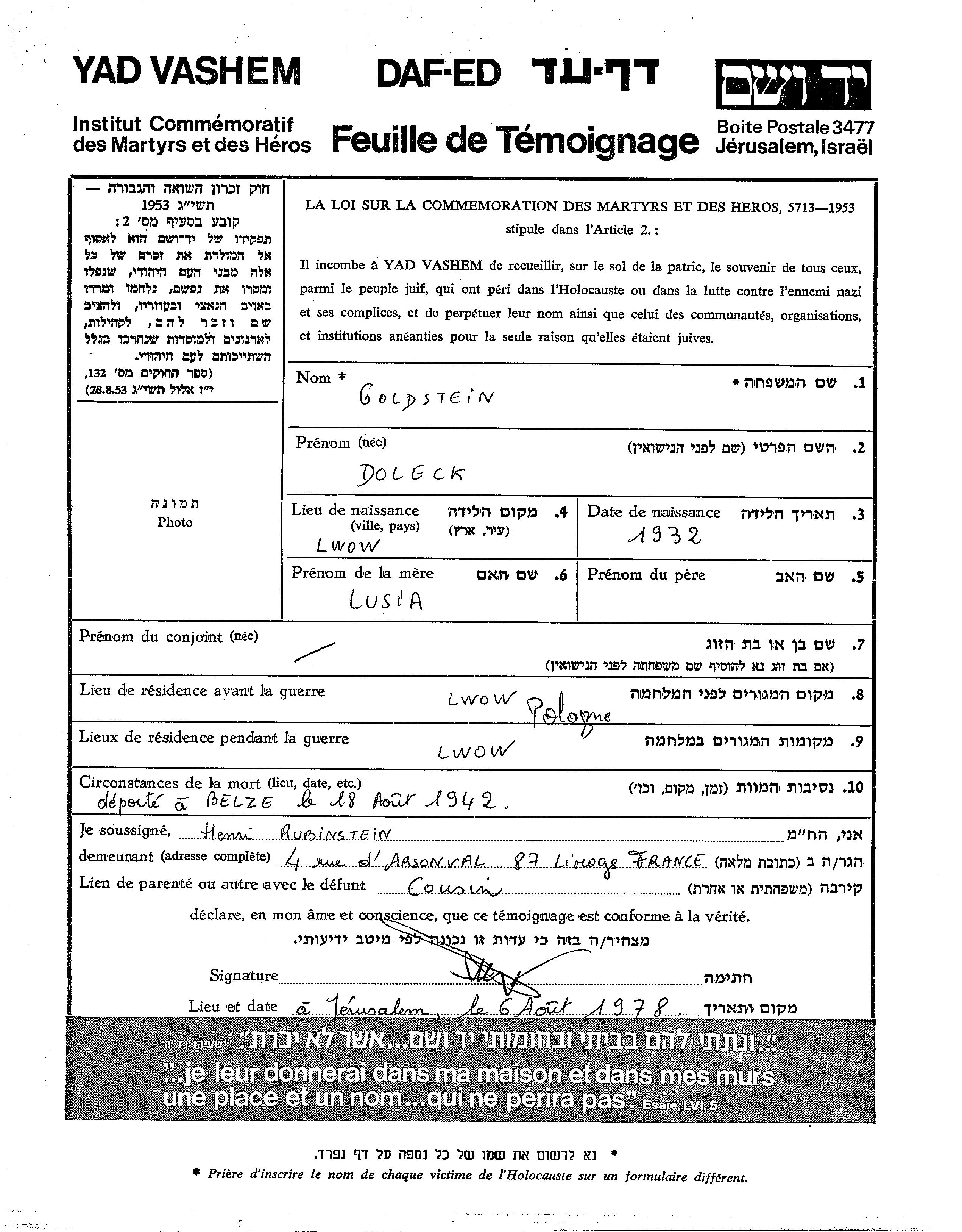 Goldstein Doleck 1932 Lwow, Poland Page of Testimony