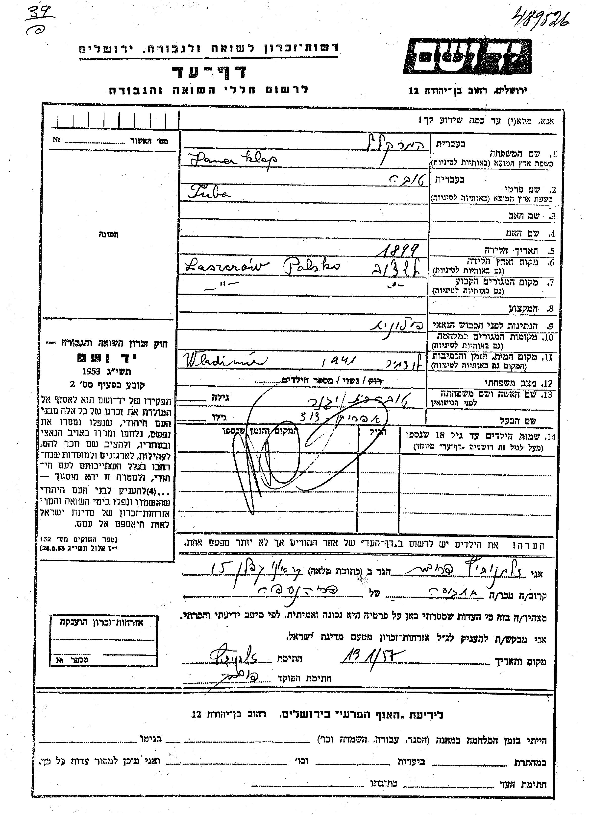 Tuba Tova Klap Hamerklap Kalef nee Egener was born in Laszczow, Poland, 1899. She was married to Efraim David. Prior to WWII she lived in Laszczow, Poland. Tuba Tova was murdered in the Shoah. Place of death: Wlodzimierz, Poland, 1941.