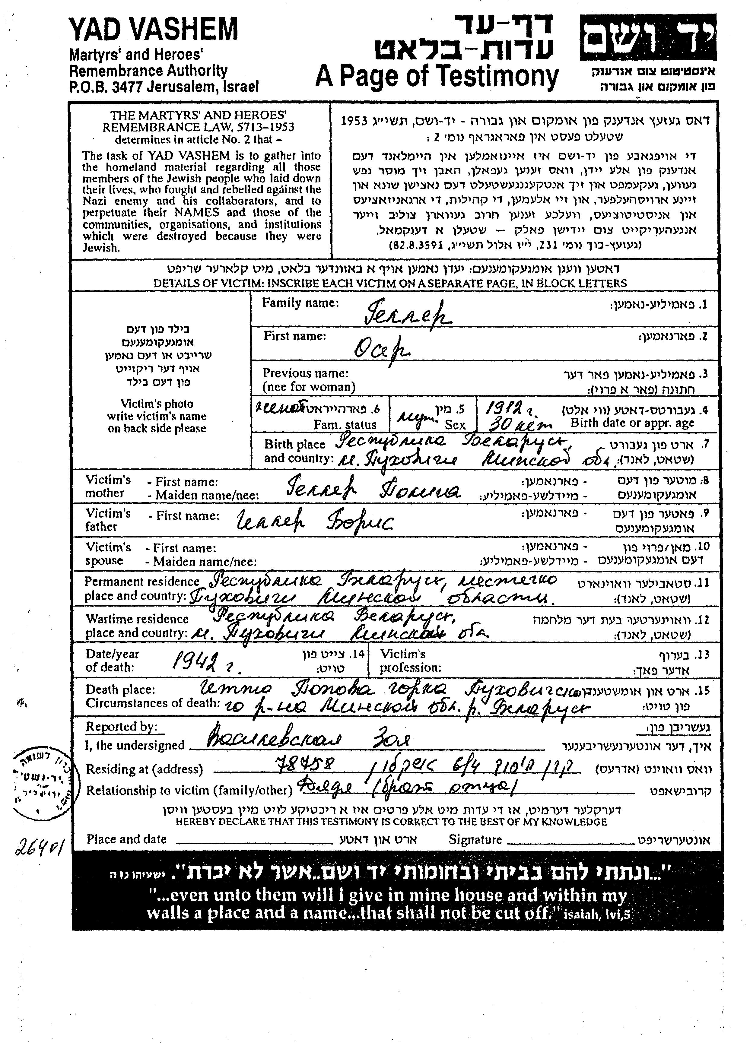 Geller Oser 1912 Pukhovichi, Belorussia (USSR) Page of Testimony