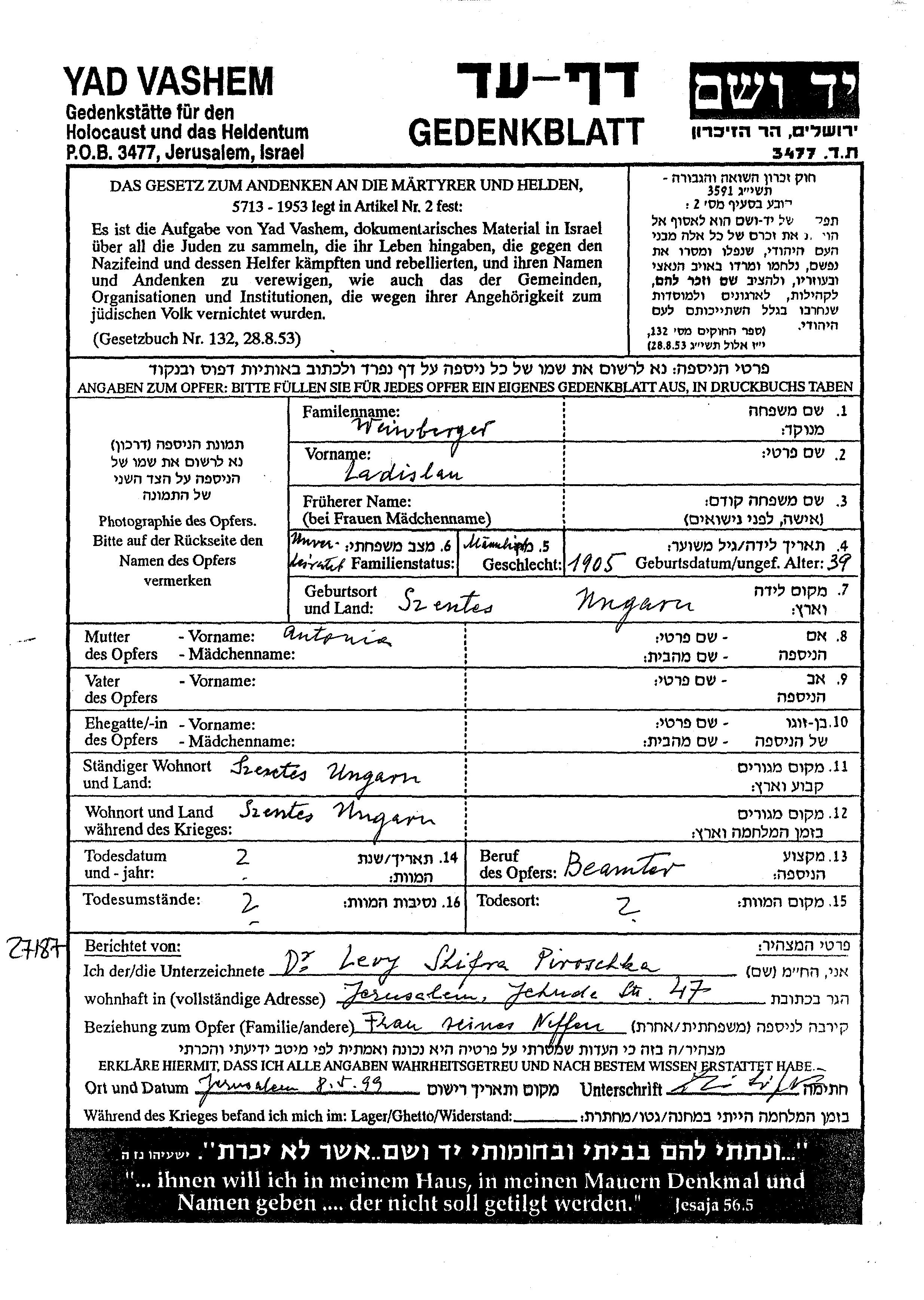 Ladislau Weinberger was born in Szentes, Hungary, 1905 to Antonia. He was a civil servant and single. Prior to WWII he lived in Szentes, Hungary. During the war he was in Szentes, Hungary. Ladislau was murdered in the Shoah.
