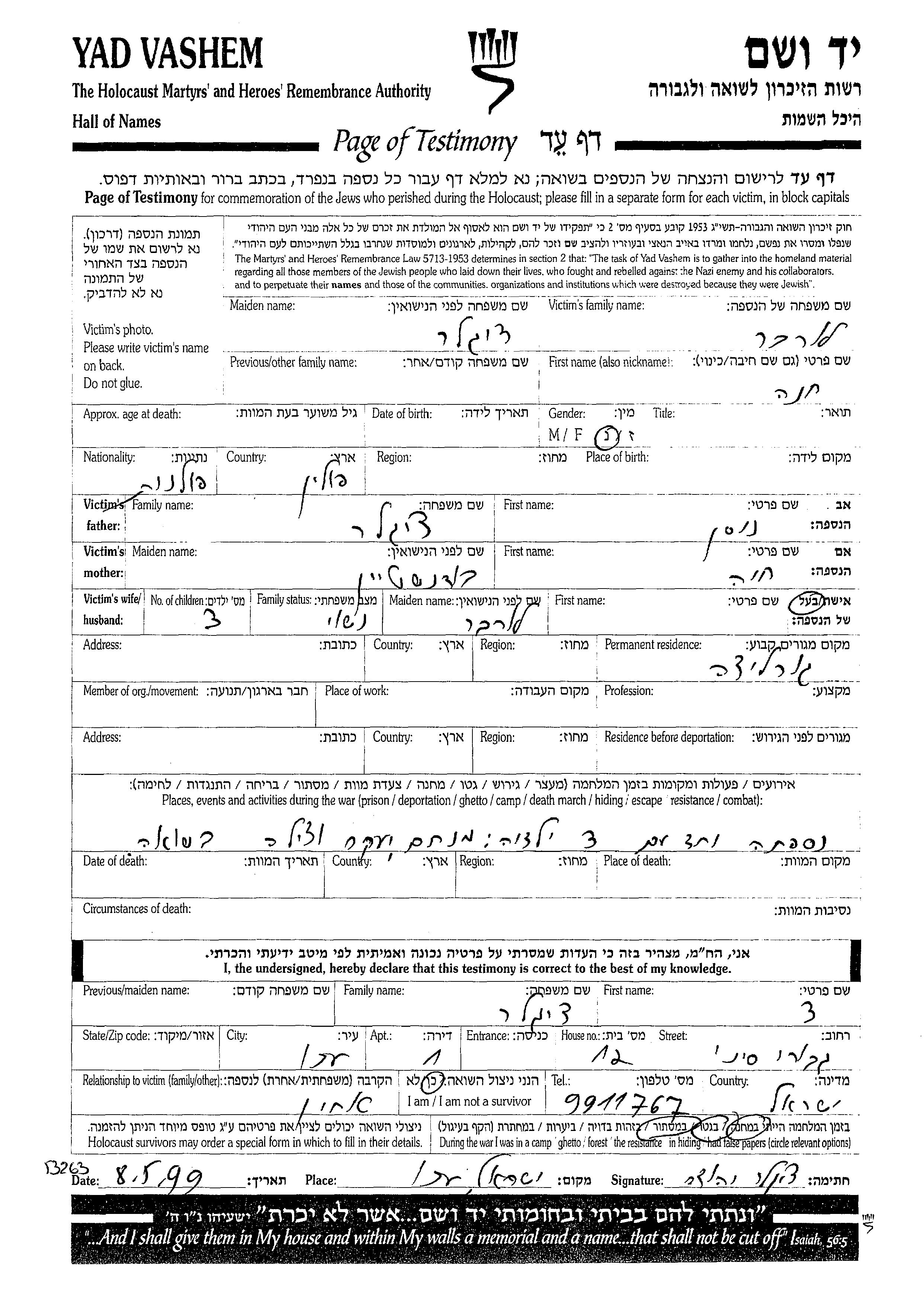 Yad Vashem - Pages of Testimony Names Memorial Collection