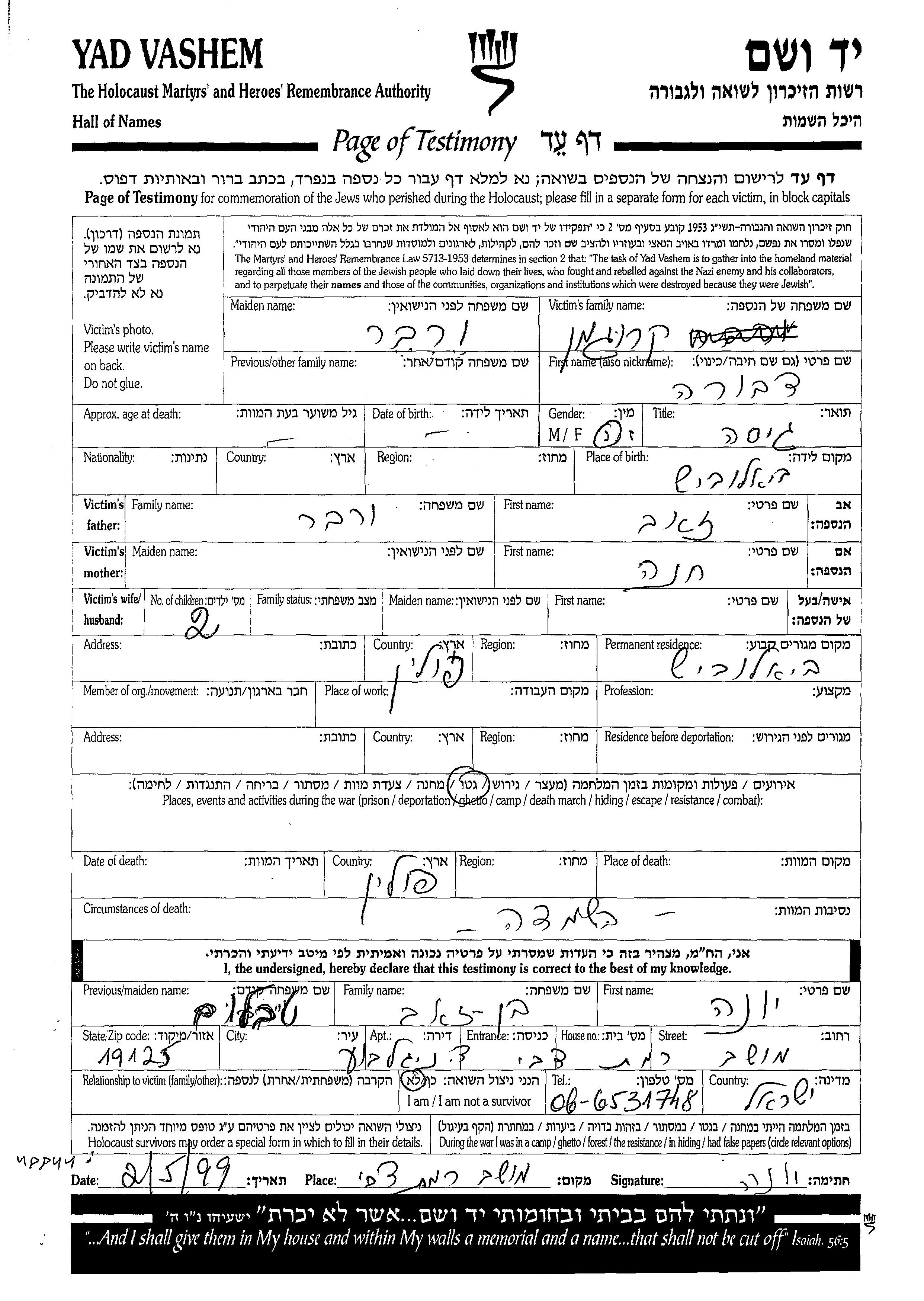 Dvora Krugman nee Verber was born in Bialowieza, Poland to Zeev and Khana. She was married. Prior to WWII she lived in Bialowieza, Poland. Dvora was murdered in the Shoah. Place of death: Poland.