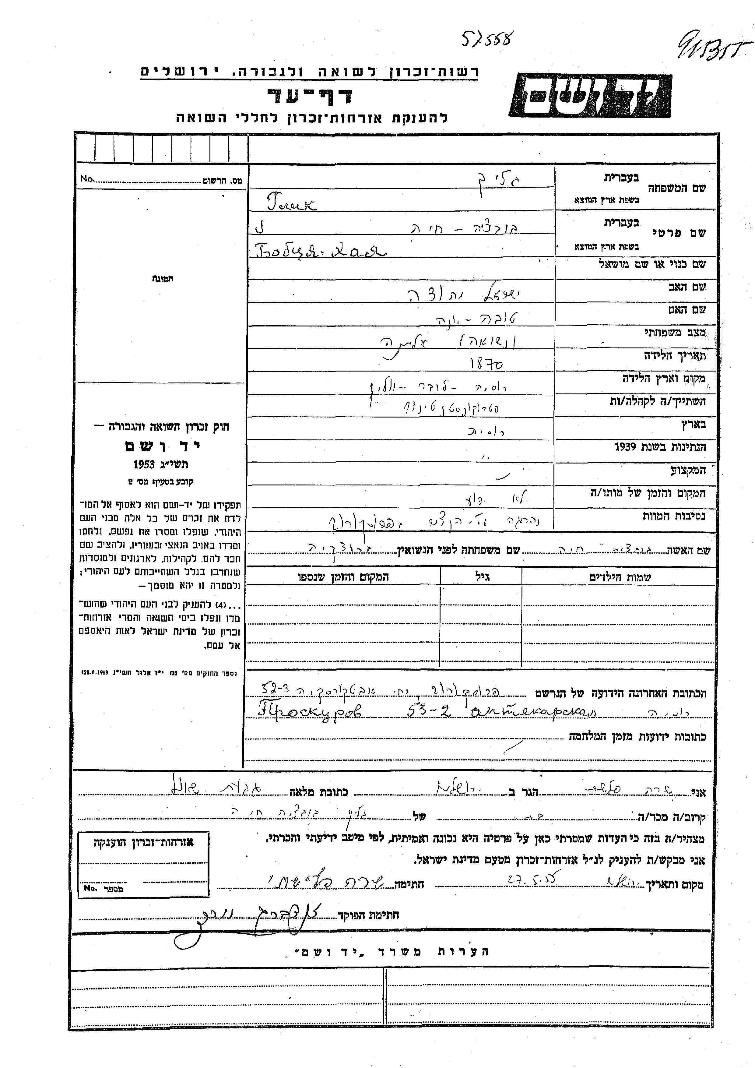 Glik Bobtzia Khaia 1870 Starokonstantinov, Ukraine (USSR) Page of Testimony