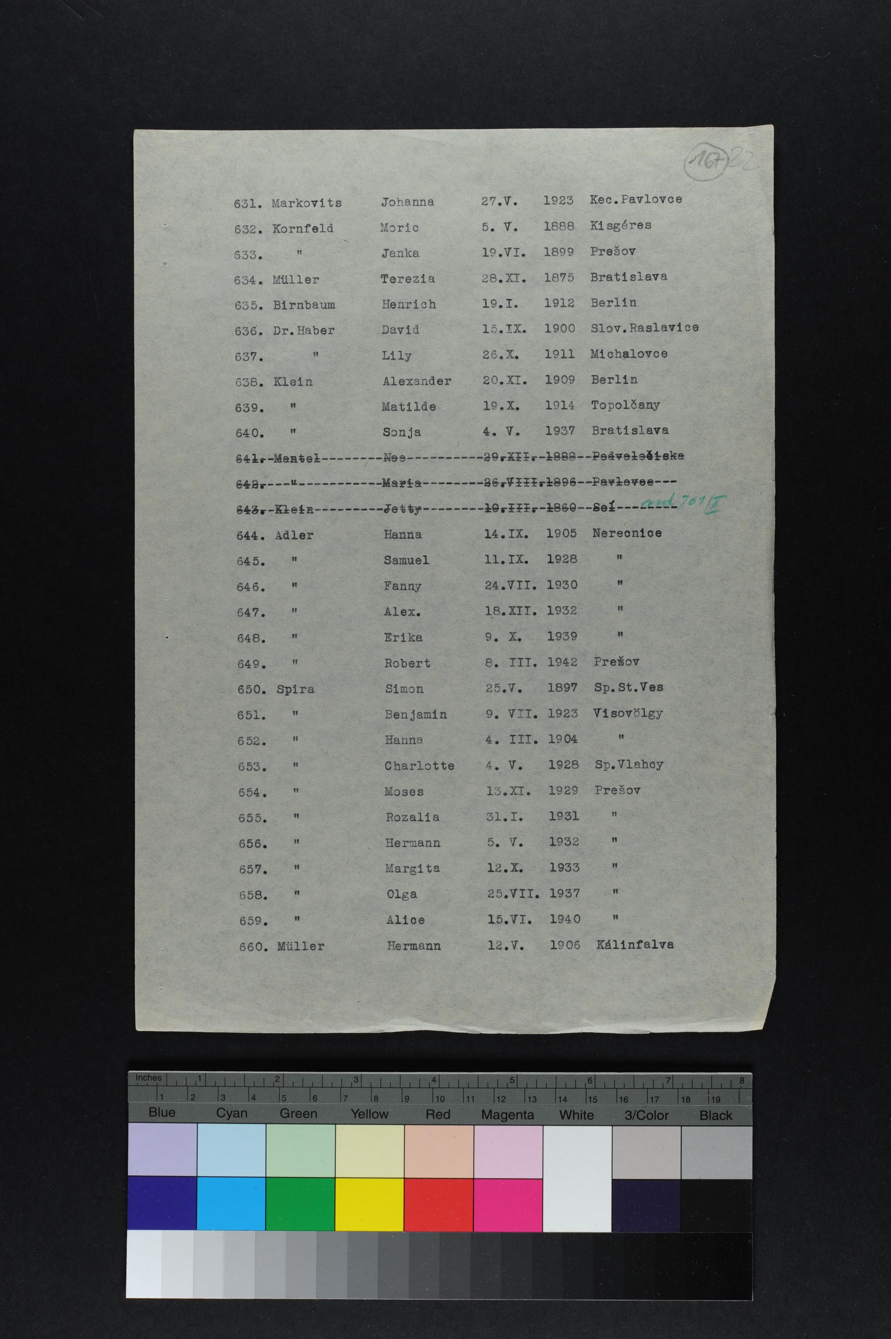 Hanna Adler was born in Neresznice, Czechoslovakia, 1905. Prior to WWII she lived in Presov, Czechoslovakia.