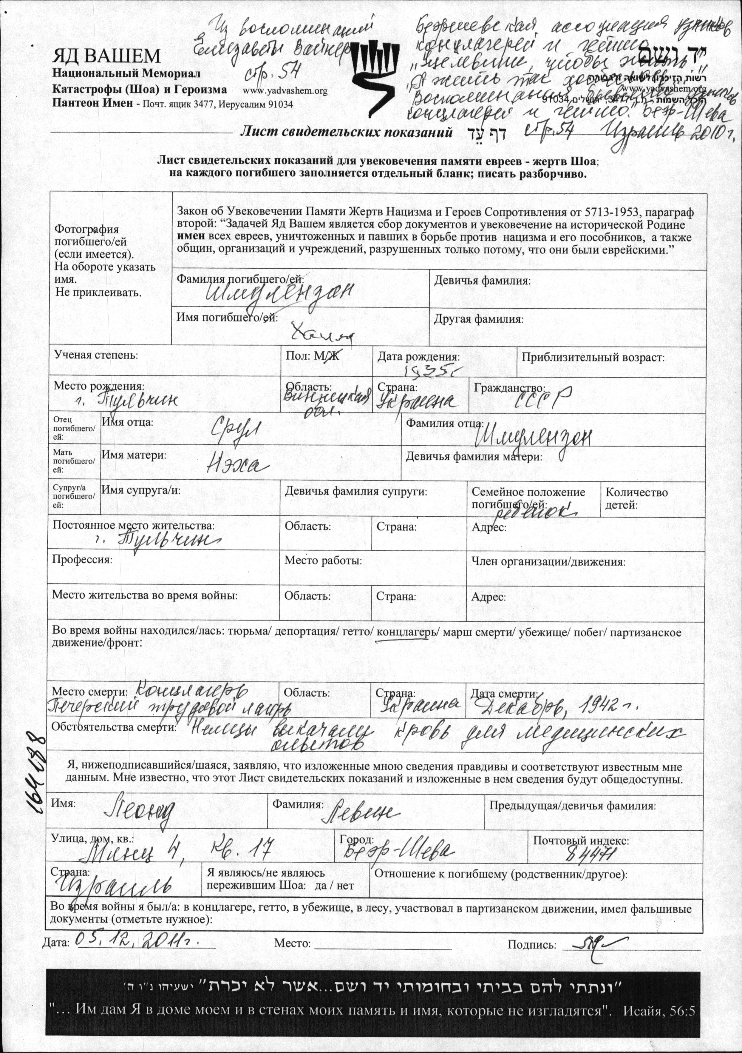 Shmulenzon Khaim 1925 Tulchin, Ukraine (USSR) Page of Testimony