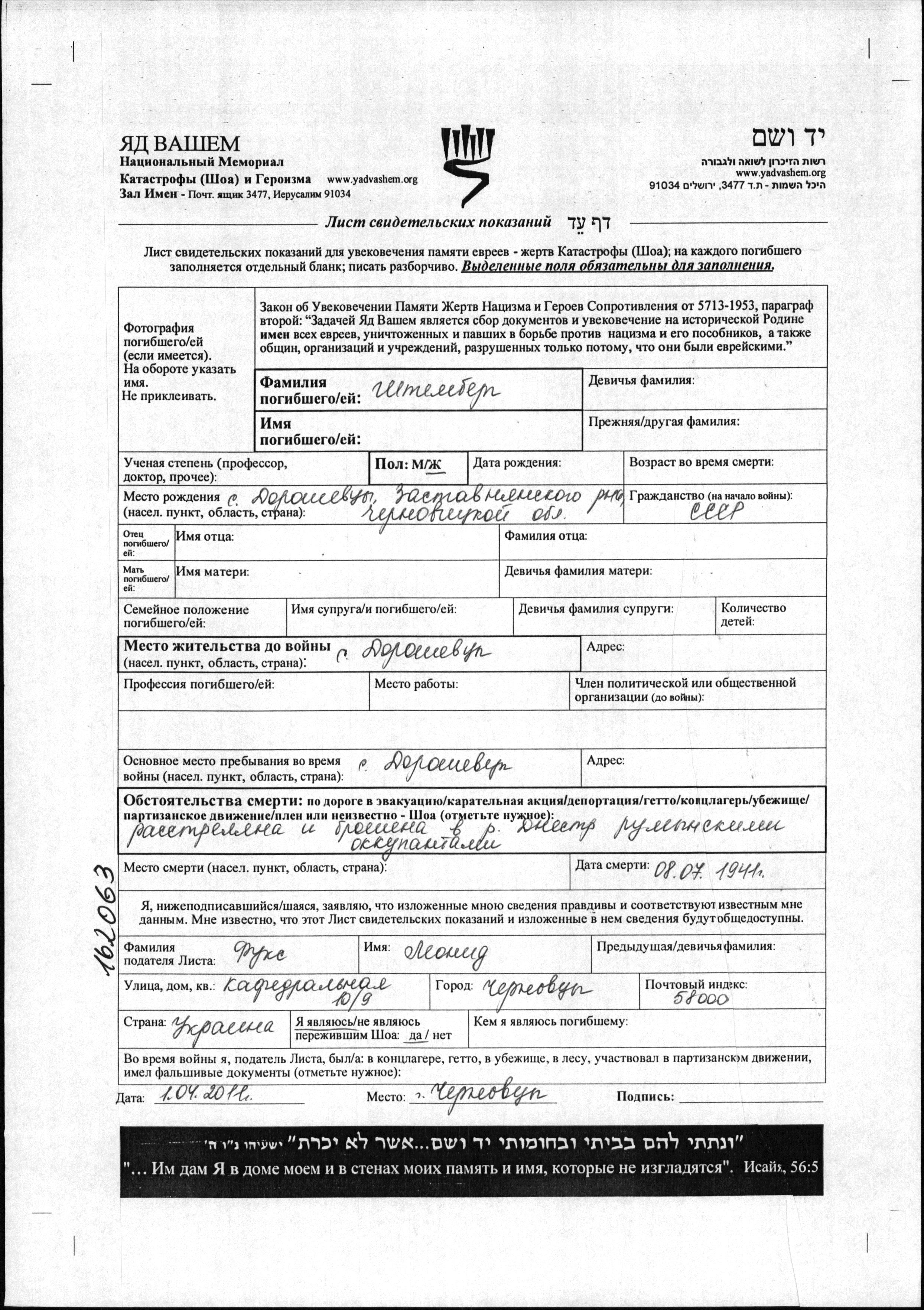 Shtemberg First name unknown Doroshivtsi, Romania Page of Testimony