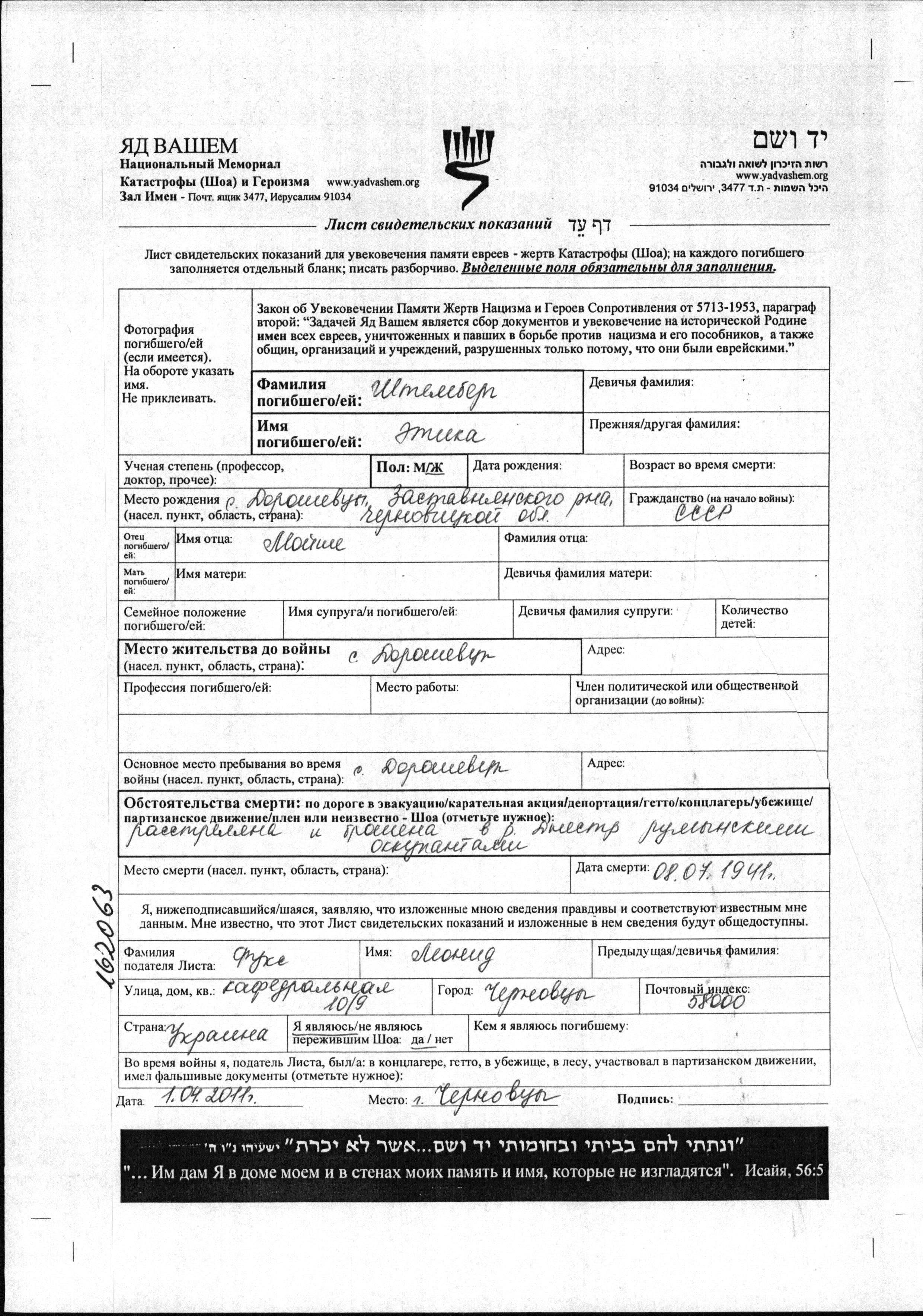 Shtember Etika Doroshovtsy, Romania Page of Testimony