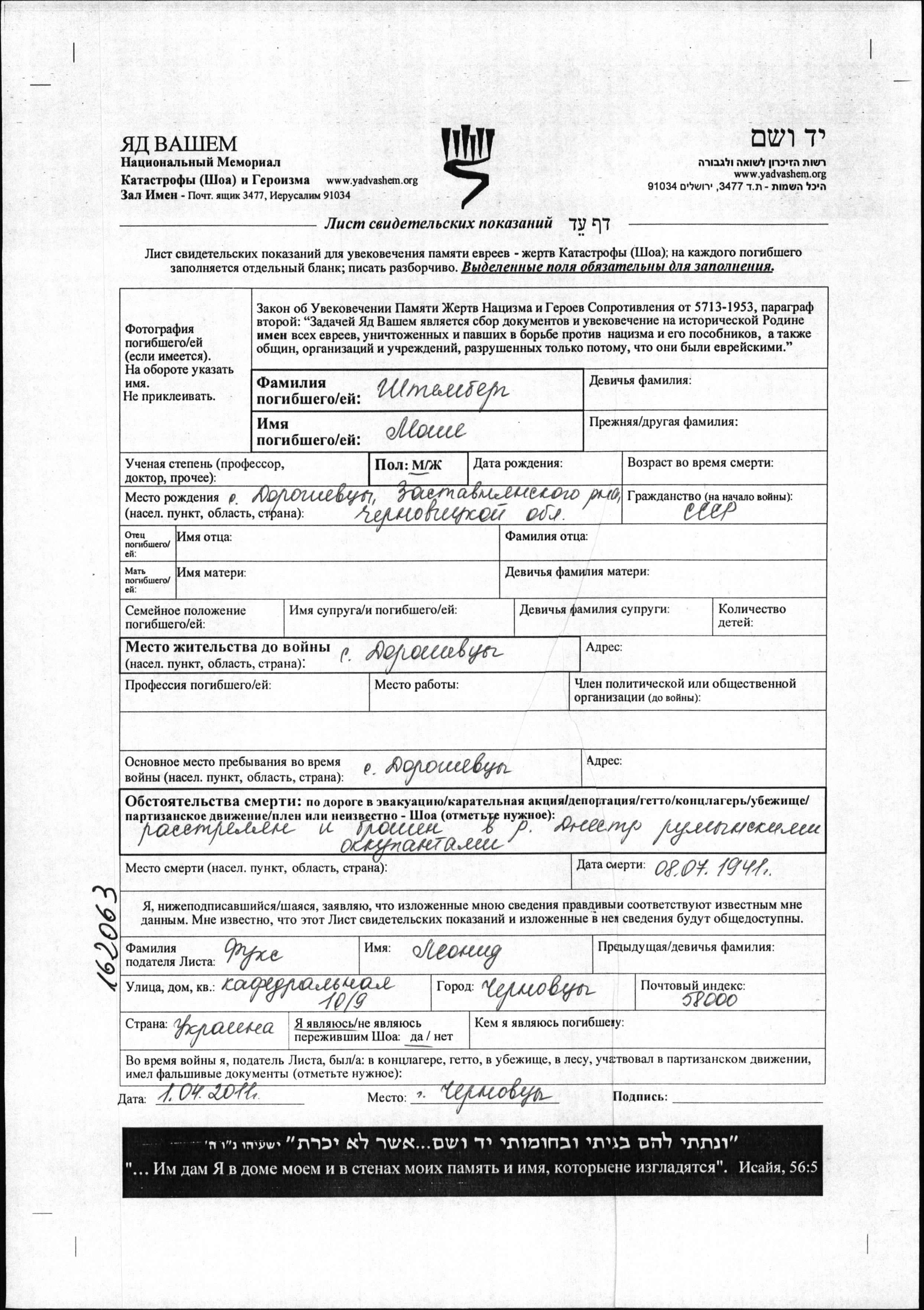 Shtember Moshe Doroshovtsy, Romania Page of Testimony