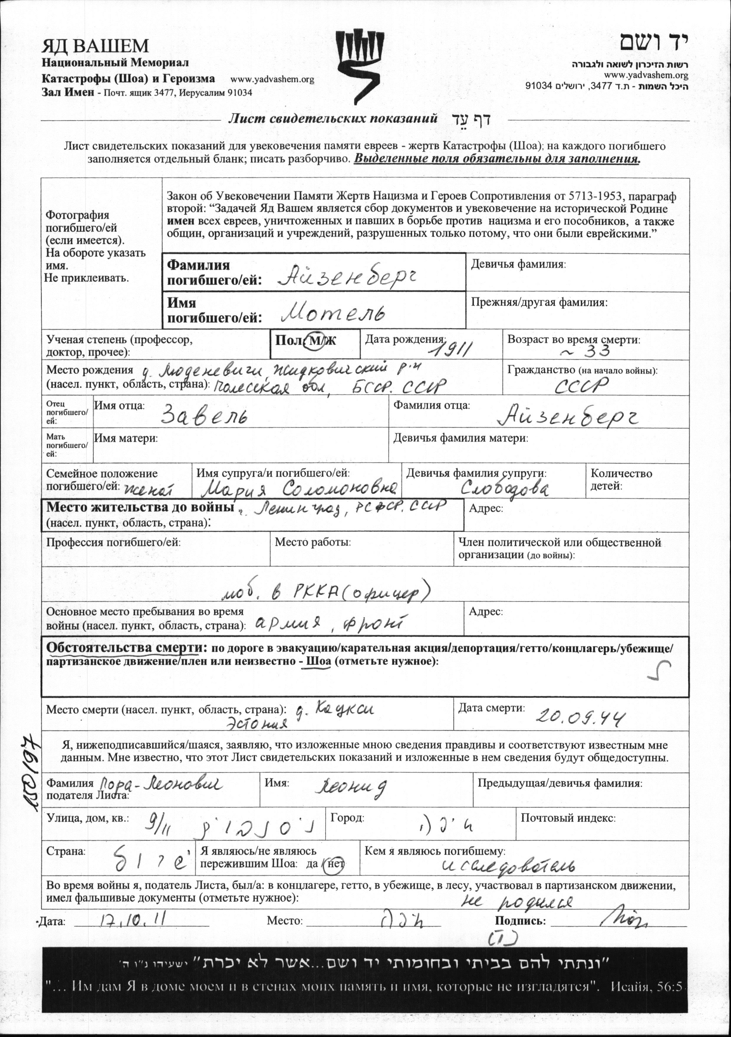 Motel Ayzenberg was born in Lyudenevichi, Belorussia (USSR), 1911 to Zavel. He was married to Mariya nee Slobodova. Prior to WWII he lived in Leningrad, Russia (USSR). During the war he was in the Soviet armed forces. Motel was killed in military service in WWII. Place of death: Kauksi, Estonia, 20/09/1944.