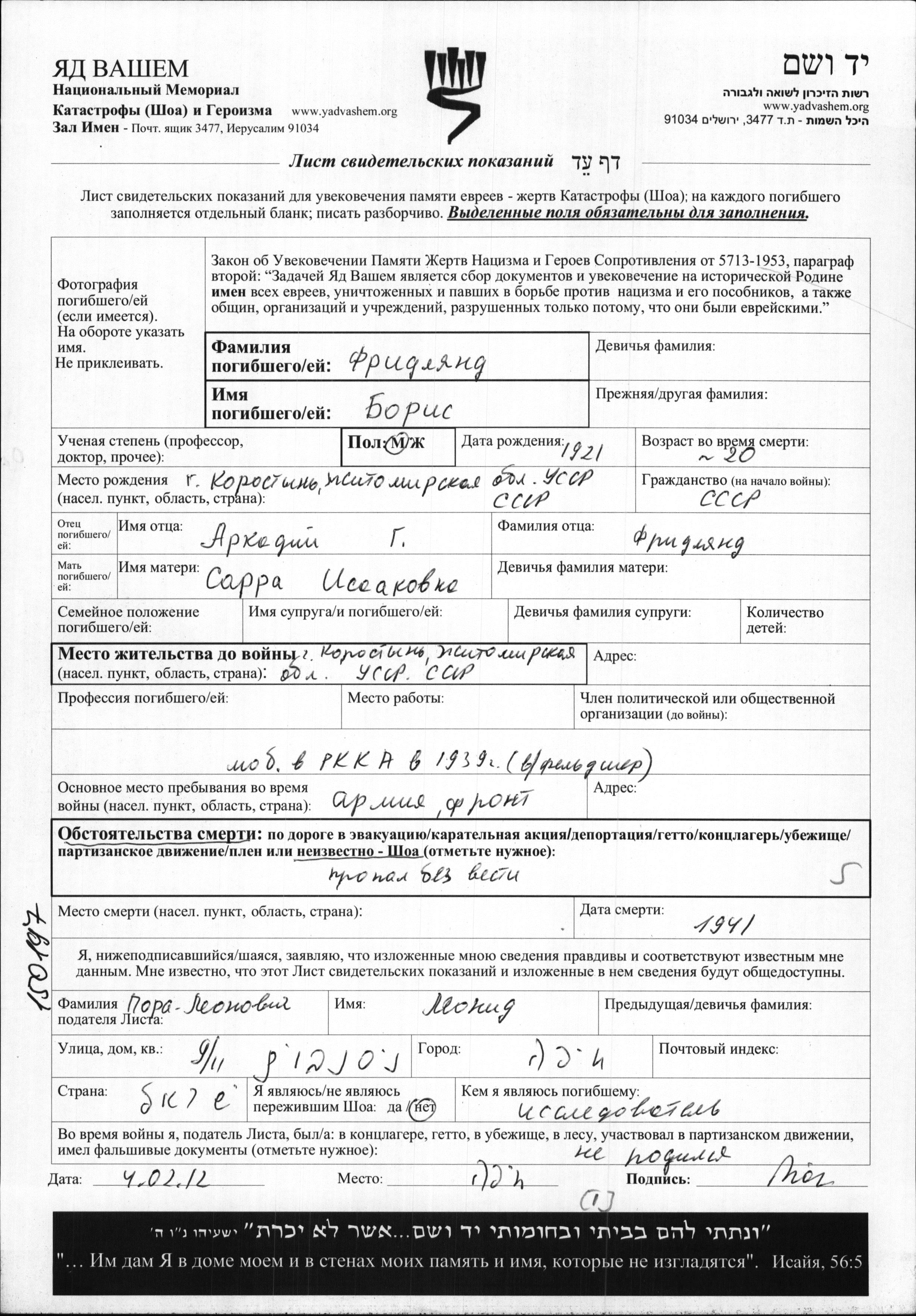 Fridlyand Boris 1921 Korosten, Ukraine (USSR) Page of Testimony